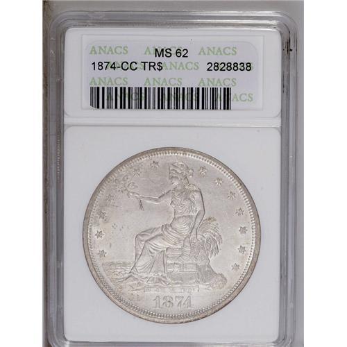 "1874-CC T$1 MS62 ANACS. Most of the 1,3"