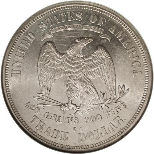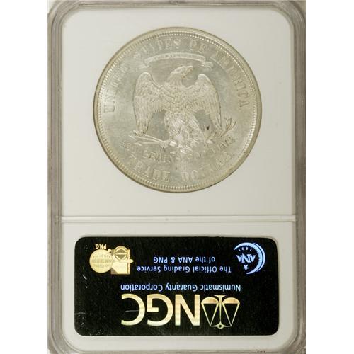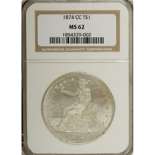 <B>1874-CC T$1 MS62 NGC.</B></I> Silver-steel fields contrast nicely with the ample quantities of mint frost found on the devices of this second-year Carson City issue. Several areas of striking weakness are noted, most prominently Liberty's hair, the eagle's right claw, the right C in the mintmark, and DOL, and the pattern suggests that the dies may have been slightly misaligned when this coin was struck. Still, any Uncirculated 1874-CC Trade dollar is a desirable coin, and this is no exception, showing no wear, a high degree of luster, and surfaces that, although abraded appropriately for the grade, remain attractive. Census: 35 in 62, 44 finer (1/07).<BR><BR><b>Shipping:</b> Coins & Currency (<a target="_blank" href="http://www.heritageauctions.com/common/shipping.php">view shipping information</a>)