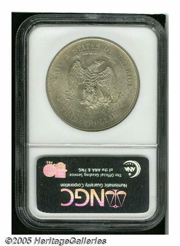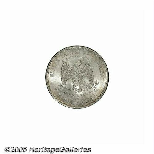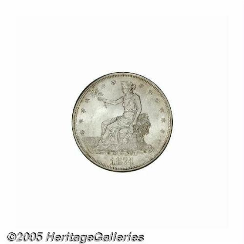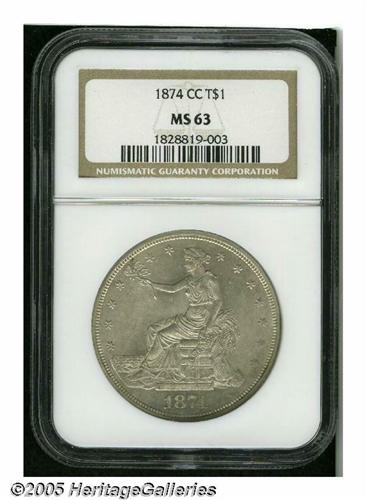 <B>1874-CC<T$1> MS63 NGC.</B></I> A lightly toned and subtly lustrous Trade Dollar, the reverse is expertly detailed while the obverse is sharp except for slight weakness of strike on the lower right side. A die crack runs across the top of the letters in OF on the reverse. With no singularly mentionable distracting abrasions, this is a fine candidate for a Select Carson City type set.