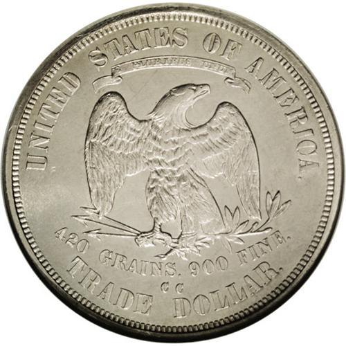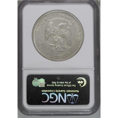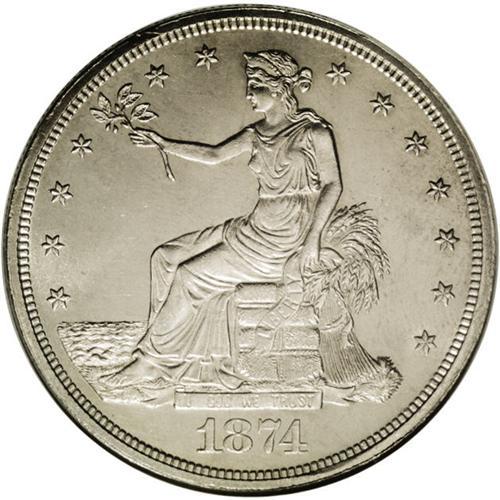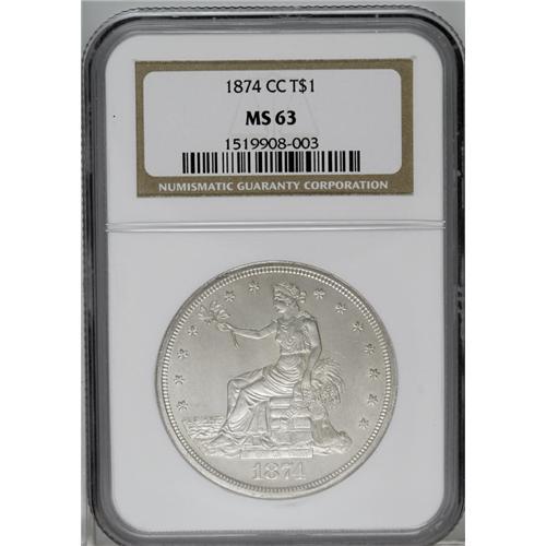 <B>1874-CC<T$1> MS63 NGC.</B></I> Essentially untoned with somewhat muted luster offset by remarkably smooth surfaces. The strike is quite well executed, particularly on the obverse, and only shows a bit of localized softness on the eagle's head. While minted in comparatively large numbers (over 1.3 million pieces), this heavily exported Carson City issue is quite scarce in Select and better Mint State grades. Census: 26 in 63, 17 finer (3/06). <BR><BR><B>Important notice:</B> Heritage usually auctions material at the rate of 200-250 lots per hour. On some occasions eBay Live bid software or the Internet may not be able to keep up with the pace of the auction. We recommend placing a realistic absentee bid now as insurance to avoid disappointment. Occasionally the auctioneer may eliminate or reject an eBay Live bid, and the auctioneer may also reopen a lot after the close of the eBay live bidding (usually because we missed an audience bid), and may reject your bid even if it shows you as the winning bidder. By bidding via eBay Live, you agree that Heritage may award the lot to another bidder at its sole discretion under the circumstances described above or any other reasonable circumstances. Since eBay bids are not shown to us until we open the lot on the floor, we treat those bids just like floor bids. In most cases the floor responds before the eBay bid is presented to us, due to Internet lag time, so for consistency we have made it a policy that floor bids are always considered first over tie eBay live bids. Also please note that all Heritage lots purchased through eBay Live carry a 20% Buyer's Premium. Please make sure you read the Terms and Conditions before you bid. This lot is being auctioned in conjunction with a live floor auction by Heritage Galleries & Auctioneers. All final auction and invoice information will be supplied by Heritage Galleries & Auctioneers, and all other information should be considered preliminary. Lot:2218 <BR><BR><B>Winning Notification and Billing:</B> After the FINAL session in this auction is complete, Heritage will send e-mail and snail mail invoices. This process normally takes several days. All final auction and invoice information will be supplied by Heritage Galleries & Auctioneers, and all other information should be considered preliminary. <BR><BR>This auction will be conducted on a live auction floor and over the Internet through eBay Live. If you choose to place an absentee bid, please take a moment to <font color='#0000ff'><u><a href='http://pages.ebay.com/liveauctions/help/before/laabsentee.html'>learn how eBay Live absentee bidding works</a></u></font><font color='#000000'>