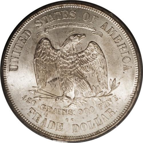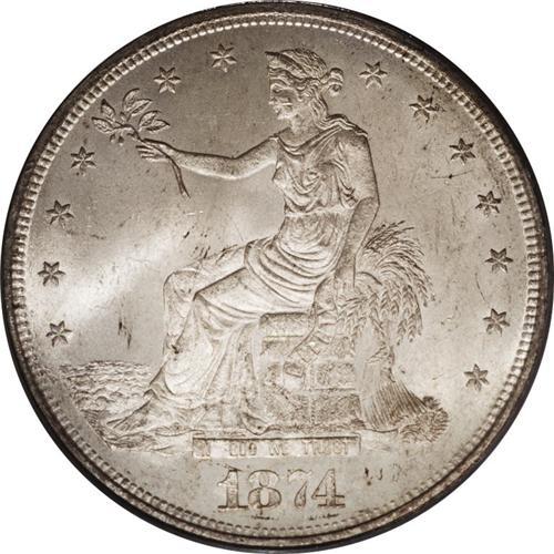 <B>1874-CC<T$1> MS64 PCGS.</B></I> Satiny luster in the fields and a sharp strike, with full definition on Liberty's profile and on the eagle too, with sharp claws and even his thigh is well defined. A few nicks on Liberty's cheek and a bagmark above the eagle's head will serve to identify this one. Toned with golden flecks on the obverse, and a bit of streaky gold on the center of the reverse. Scarcer than the mintage would imply, as the vast majority were sent to the Orient where they have slowly trickled back home with multiple chopmarks to recall their trip overseas. Population: 13 in 64, 2 finer (4/06).