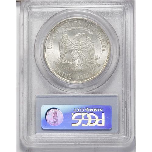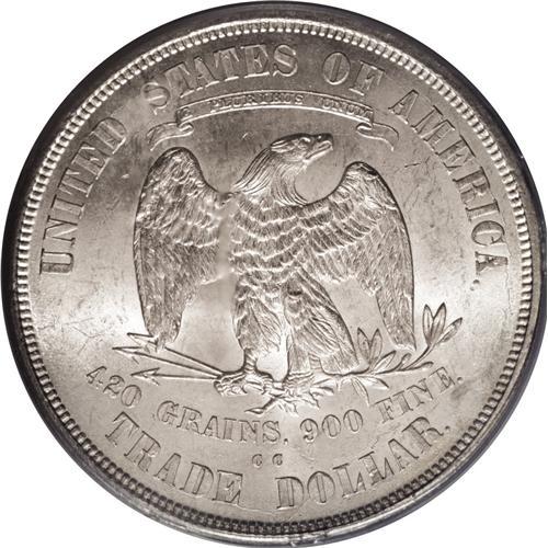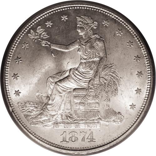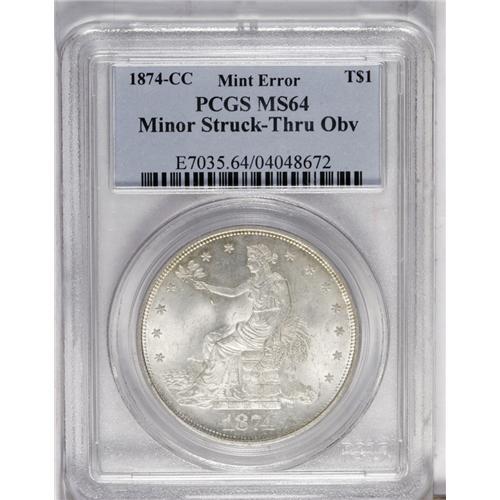 <B>1874-CC T$1 --Minor Struck-Through Obverse--MS64 PCGS.</B></I> Wide CC mintmark. Gently toned and fully lustrous with pleasing surfaces. Sharply struck, and particularly bold for the type on Liberty's head and the eagle's right (facing) leg. The strike-through noted on the PCGS insert is moderate in size, and located on Liberty's lower legs. Further interest is provided by a network of slender die cracks on both borders, and missing detail on the sheaf of wheat, as made from a lapped obverse die. Population: 14 in 64, 2 finer (10/06).<BR><BR><b>Shipping:</b> Coin/Currency (<a target="_blank" href="http://www.heritageauctions.com/common/shipping.php">view shipping information</a>)