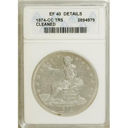 <B>1874-CC T$1 --Cleaned--ANACS. XF40 Details.</B></I> NGC Census: (0/170). PCGS Population (5/213). Mintage: 1,373,200. Numismedia Wsl. Price for NGC/PCGS coin in XF40: $425. (#7035)<BR><BR><B>Coin Engraver:</B> William Barber<BR><BR><b>Shipping:</b> Coins & Currency (<a target="_blank" href="http://www.heritageauctions.com/common/shipping.php">view shipping information</a>)