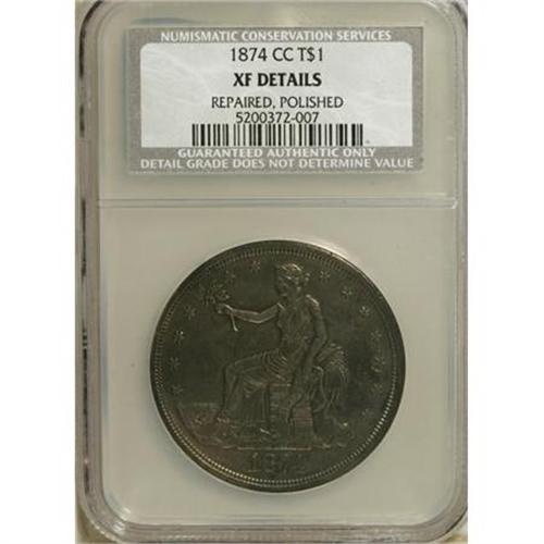 <B>1874-CC T$1 --Polished, Repaired--NCS. XF Details.</B></I> NGC Census: (0/170). PCGS Population (5/213). Mintage: 1,373,200. Numismedia Wsl. Price for NGC/PCGS coin in XF40: $425. (#7035)<BR><BR><B>Coin Engraver:</B> William Barber<BR><BR><b>Shipping:</b> Coins & Currency (<a target="_blank" href="http://www.heritageauctions.com/common/shipping.php">view shipping information</a>)