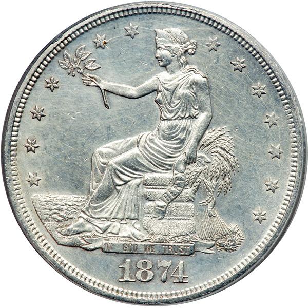 1874-CC Trade Dollar. Our grade is Sharpness of MS60+. Light hairlines, boldly struck, and untoned. The Carson Mint struck Trade Dollars from 1873 to 1878, when minting for circulation was suspended (never to be resumed). An affordable series, the CC-dated pieces can be assembled without much difficulty into a representative set of these fascinating big silver coins (PCGS # 7035) .