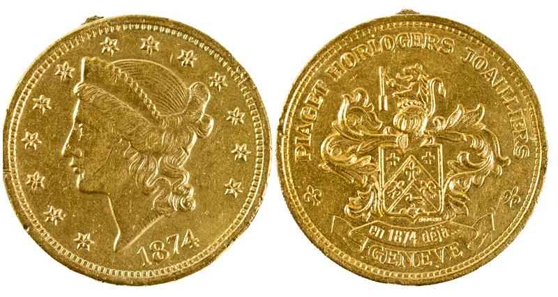 Storecard counter. Obverse United States 1874 $20. Reverse, "Piaget Horlogers Joailliers en 1874 deja" plated? Geneve, Switzerland. Uncertified, very fine. Reeded edge with solder for attachment.
