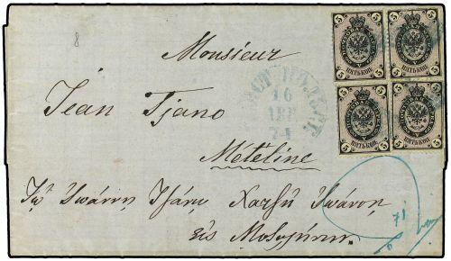 1874 Entire to METELIN franked four 5k. tied by instinct date stamp in blue.