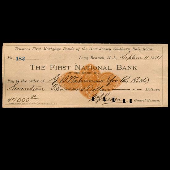 RARE 1874 original bank trustees check with excellent embossed dollar amount cancellation and RARE intact preprinted documentary stamp
