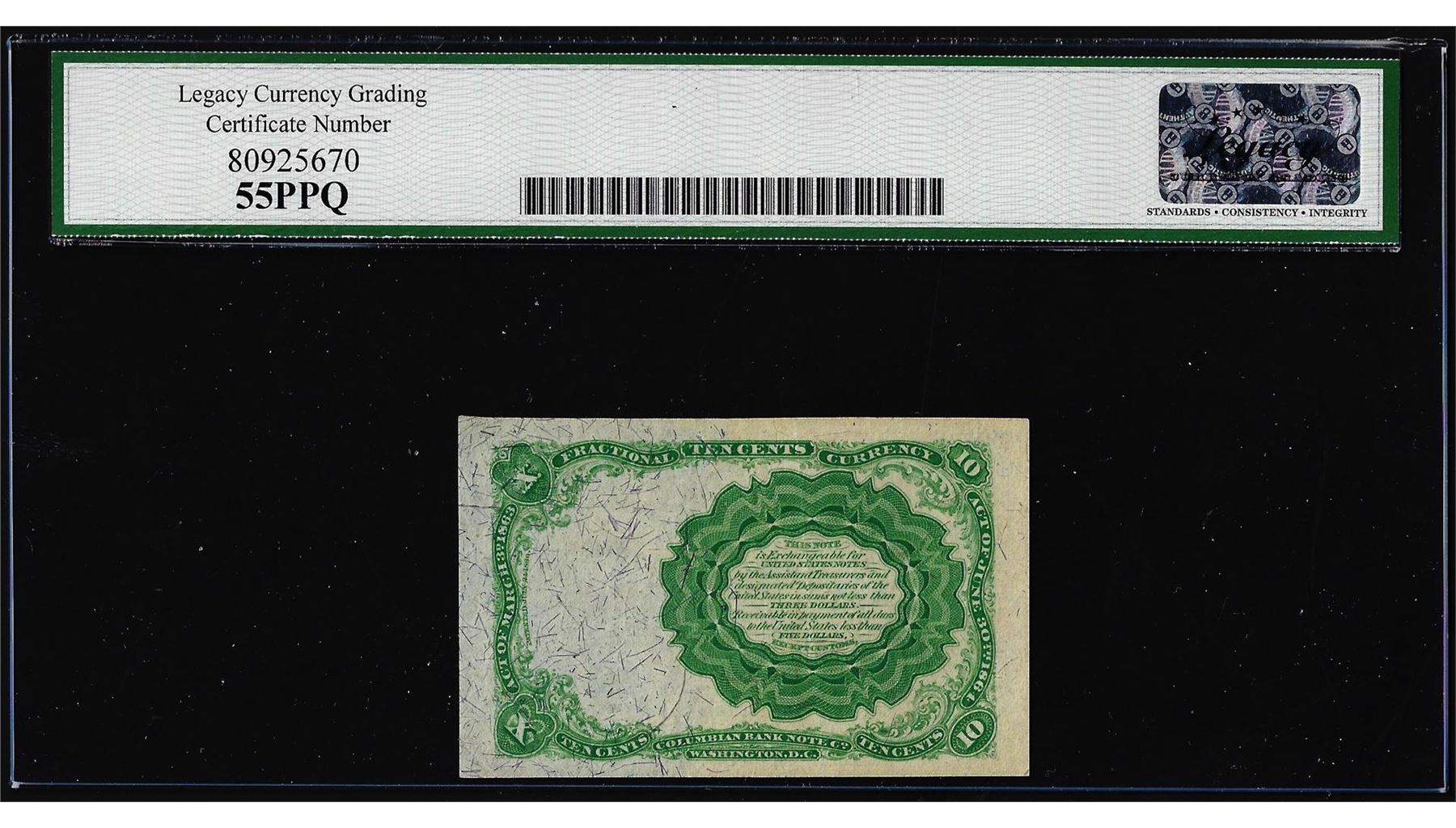 One 1874 Fifth Issue 10 Cent Fractional Currency Note Fr.1264 Legacy Ch. About New 55PPQ. Legacy Graded.