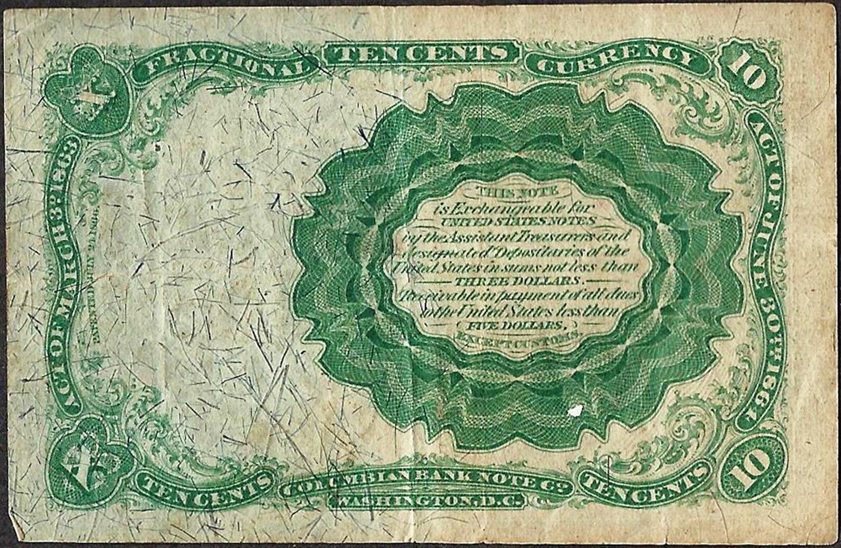 One 1874 Fifth Issue 10 Cent Fractional Currency Note.