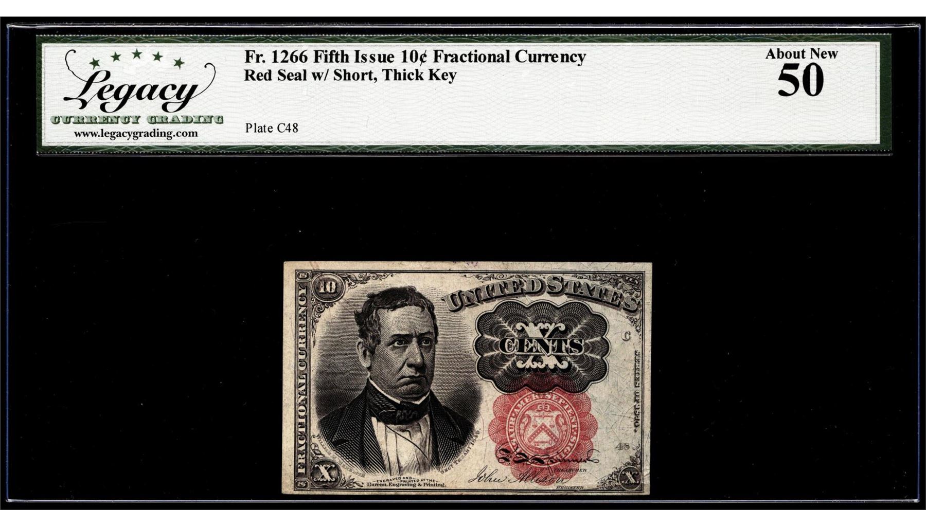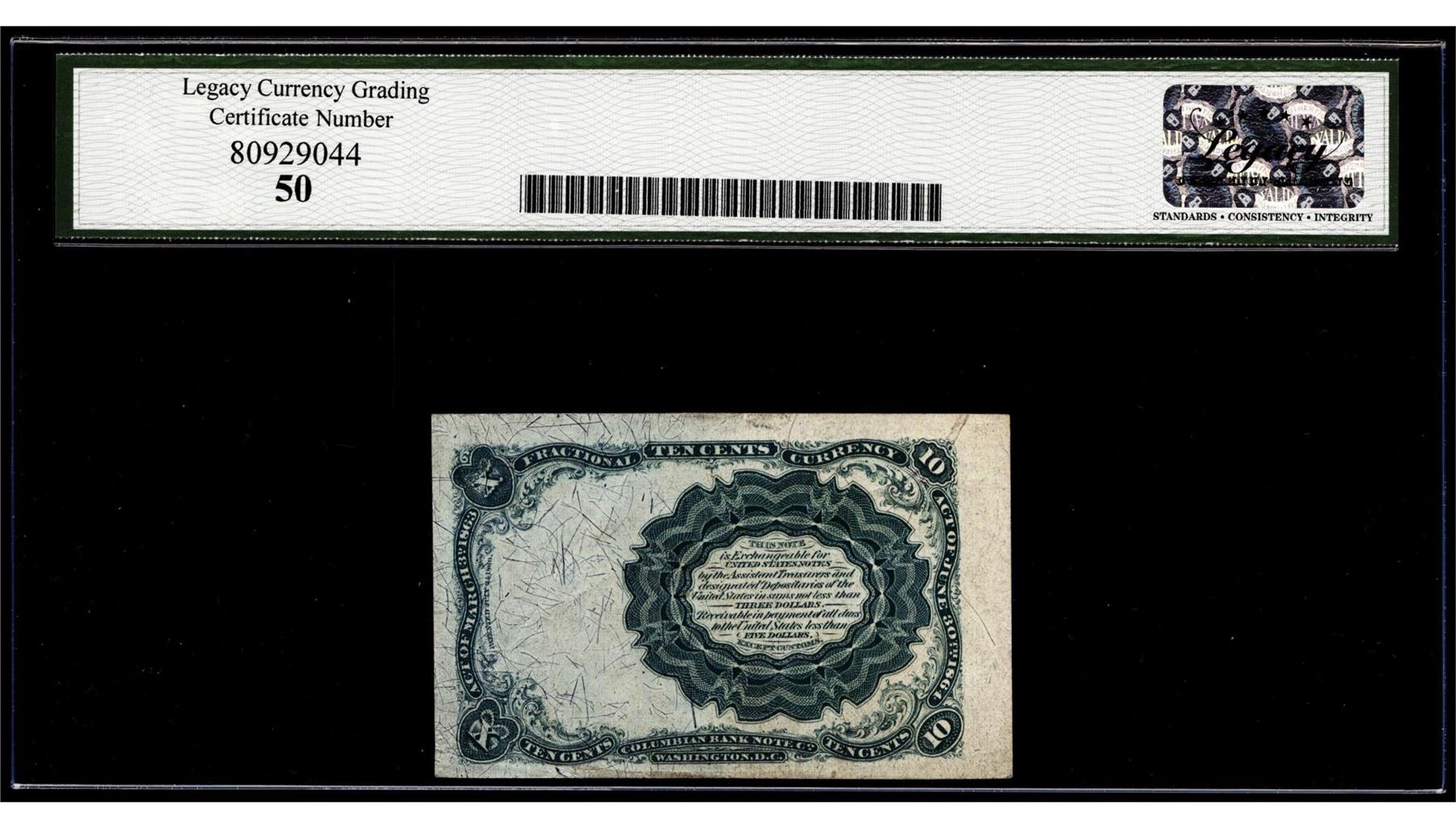 One 1874 Fifth Issue 10 Cents Fractional Currency Note Fr.1266 Legacy About New 50. Legacy Graded.