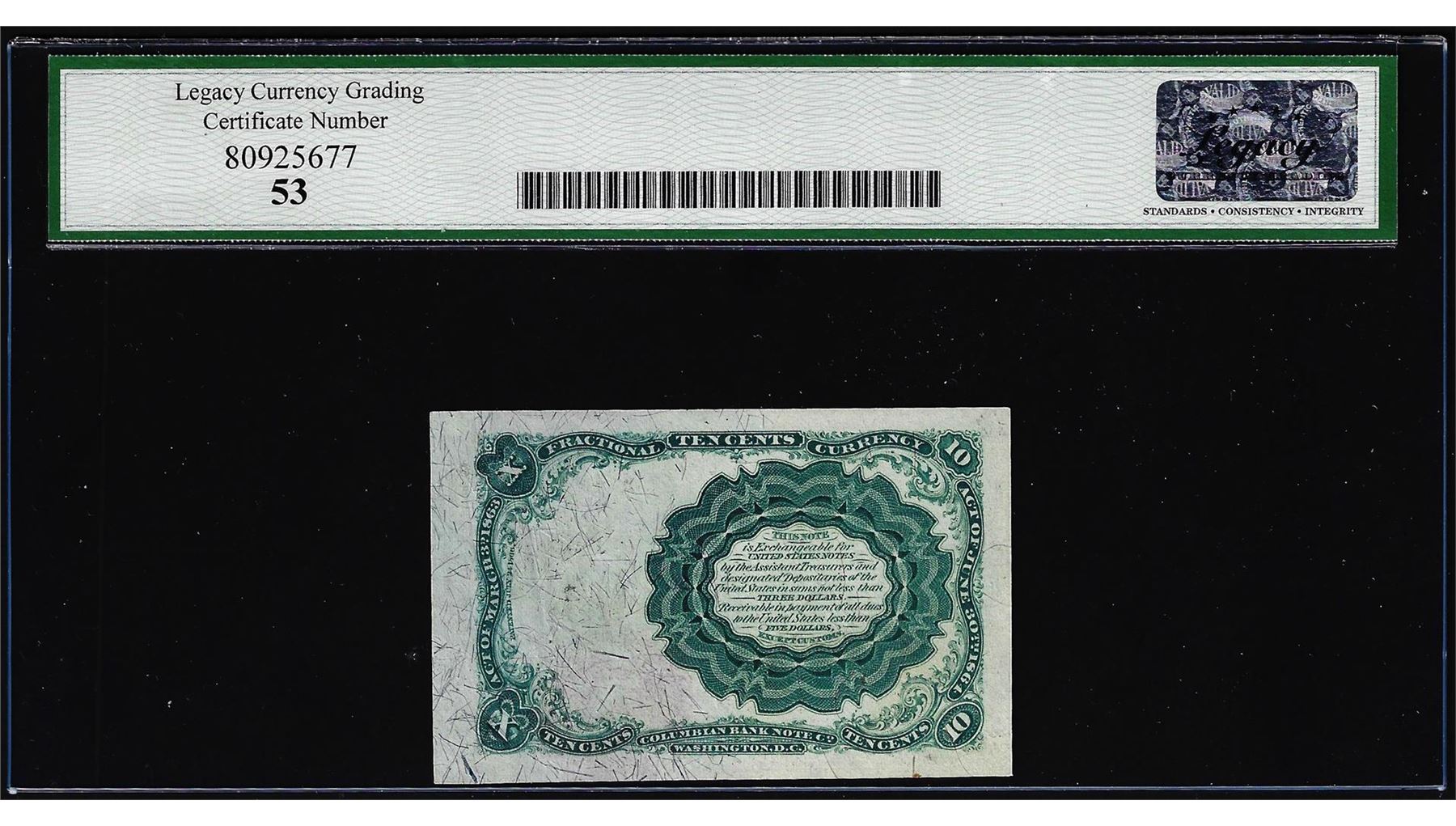 One 1874 Fifth Issue 10 Cents Fractional Currency Note Fr.1266 Legacy About New 53. Legacy Graded.