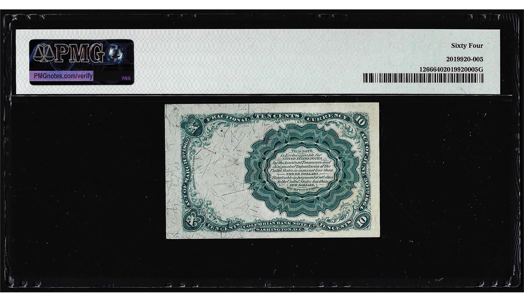 One 1874 Fifth Issue 10 Cents Fractional Currency Note Fr.1266 PMG Choice Uncirculated 64. PMG Certified.