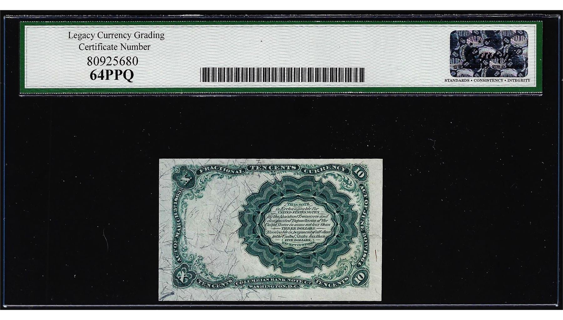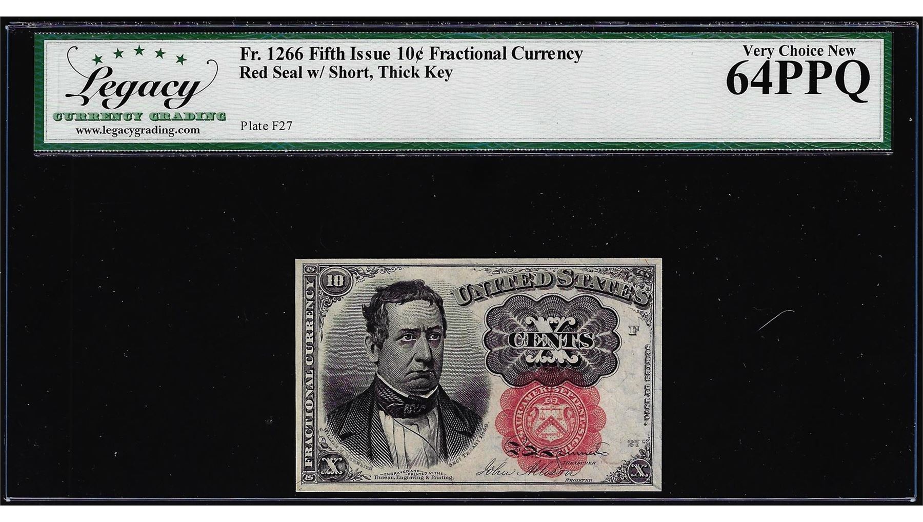 One 1874 Fifth Issue 10 Cents Fractional Note Fr.1266 Legacy Very Choice New 64PPQ. Legacy Graded.