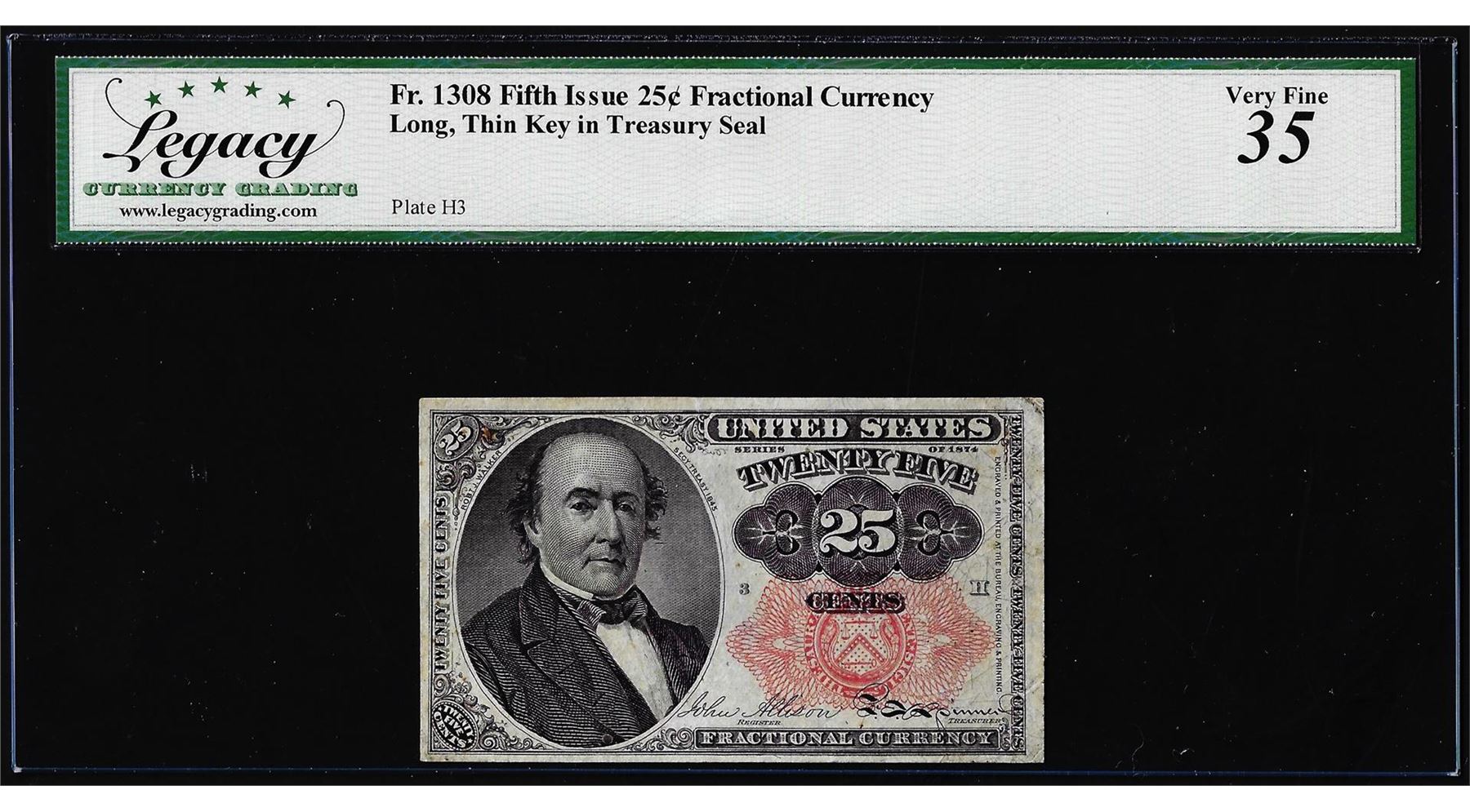 One 1874 Fifth Issue 25 Cent Fractional Currency Note Fr.1308 Legacy Very Fine 35. Legacy Graded.