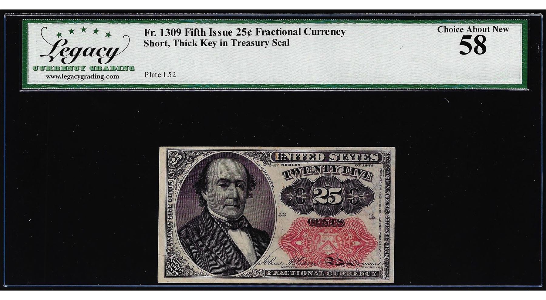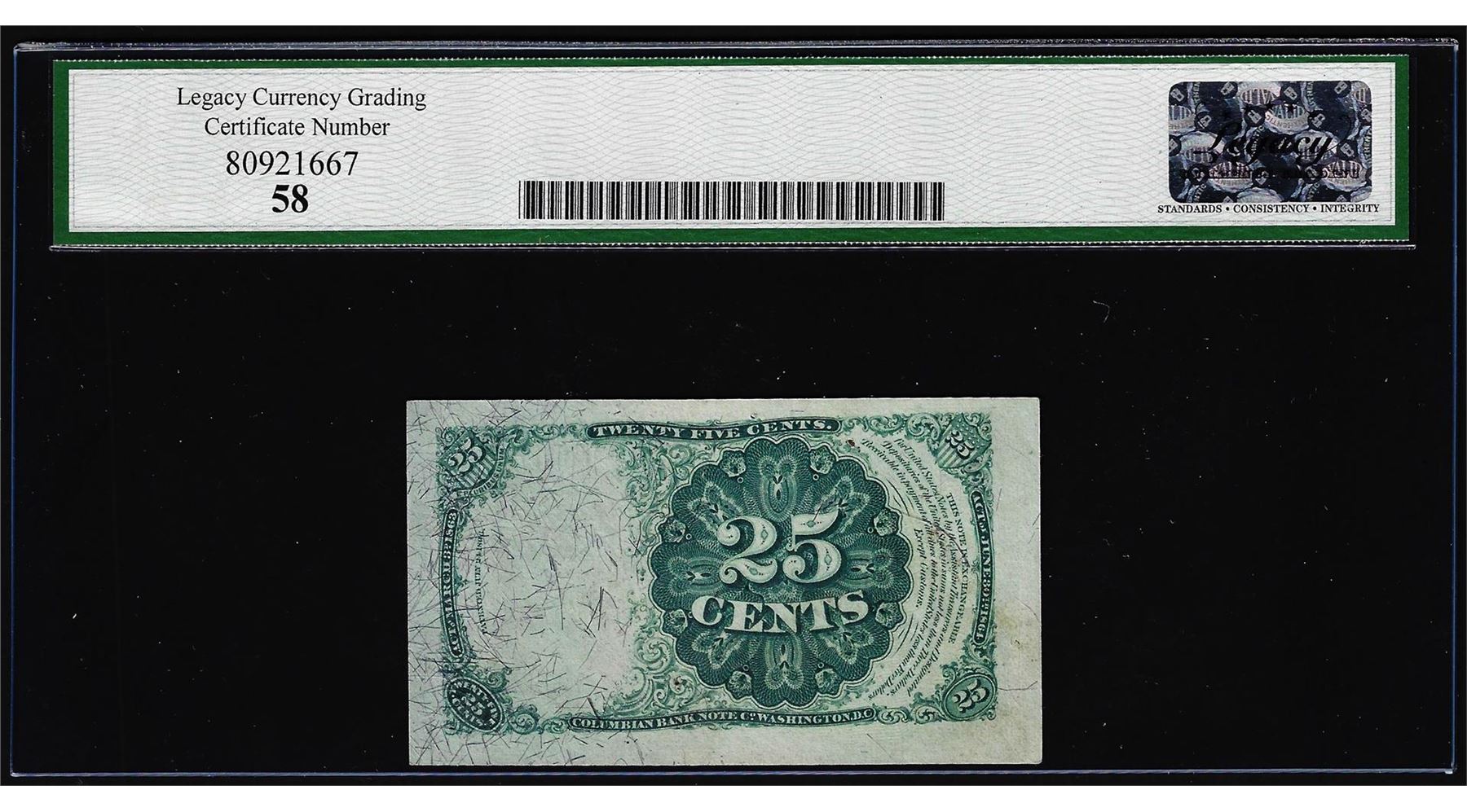 One 1874 Fifth Issue 25 Cent Fractional Currency Note Fr.1309 Legacy Choice About New 58. Legacy Graded.
