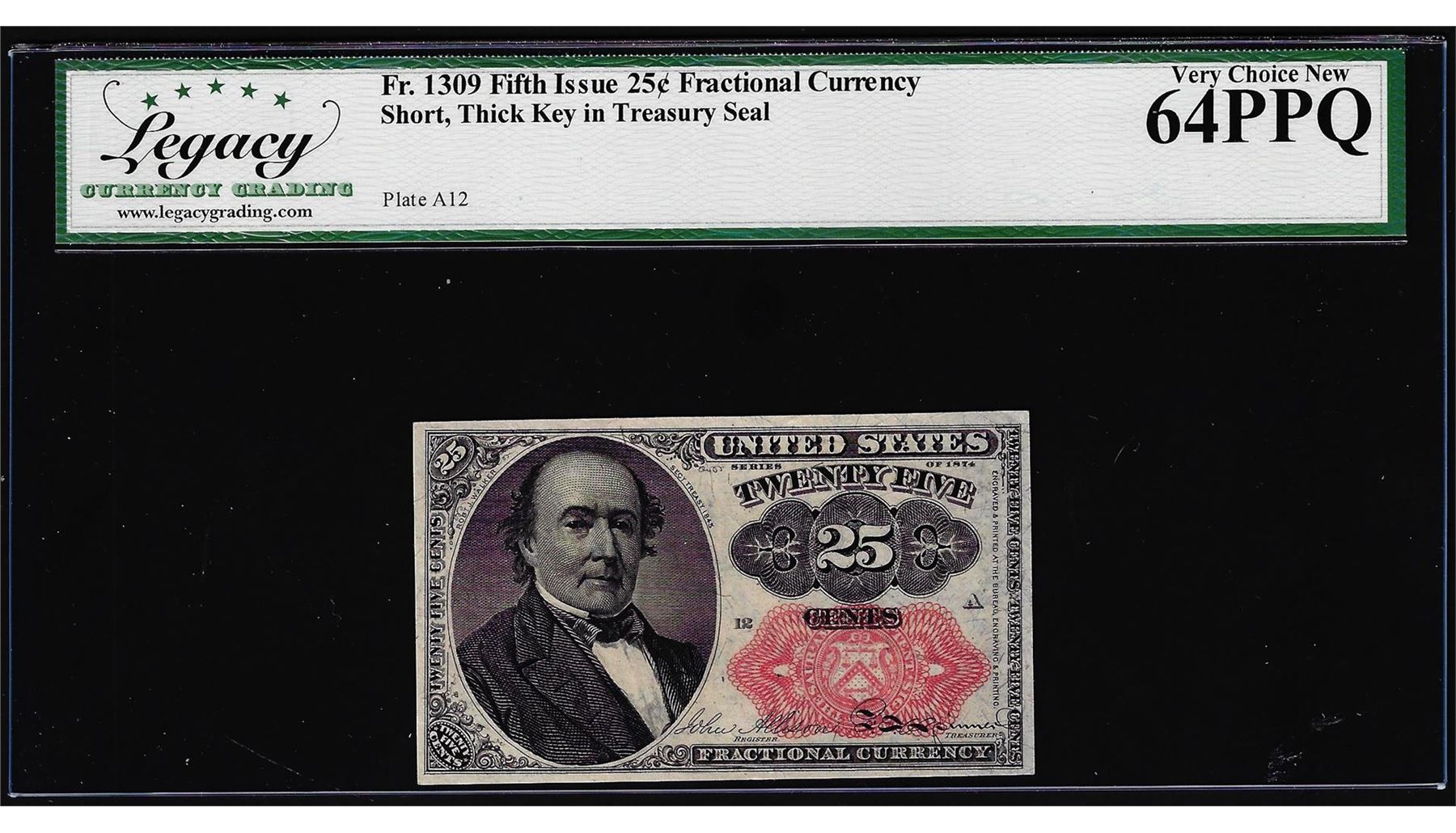 One 1874 Fifth Issue 25 Cent Fractional Note Fr.1309 Legacy Very Choice New 64PPQ. Legacy Graded.