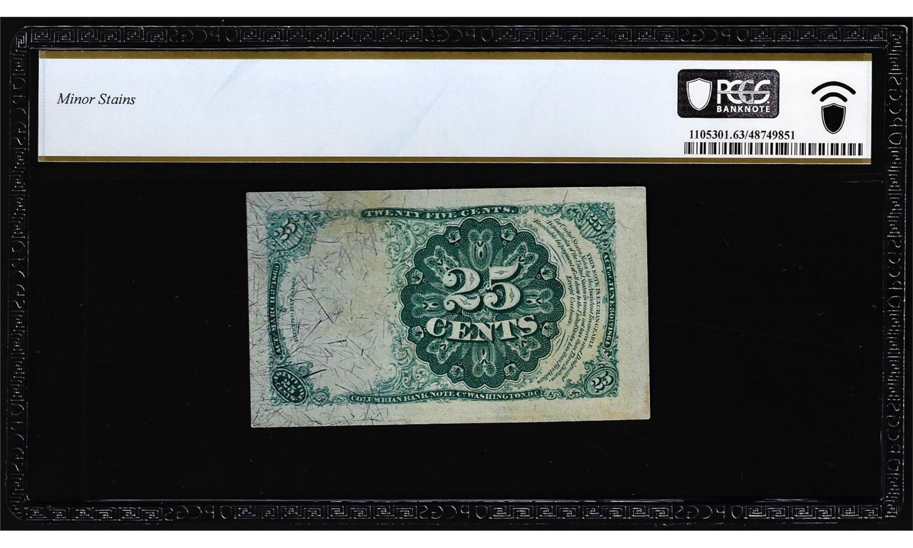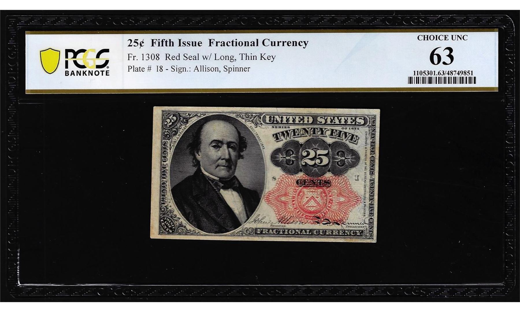 One 1874 Fifth Issue 25 Cents Fractional Currency Note Fr.1308 PCGS Choice Unc 63. PCGS Graded.