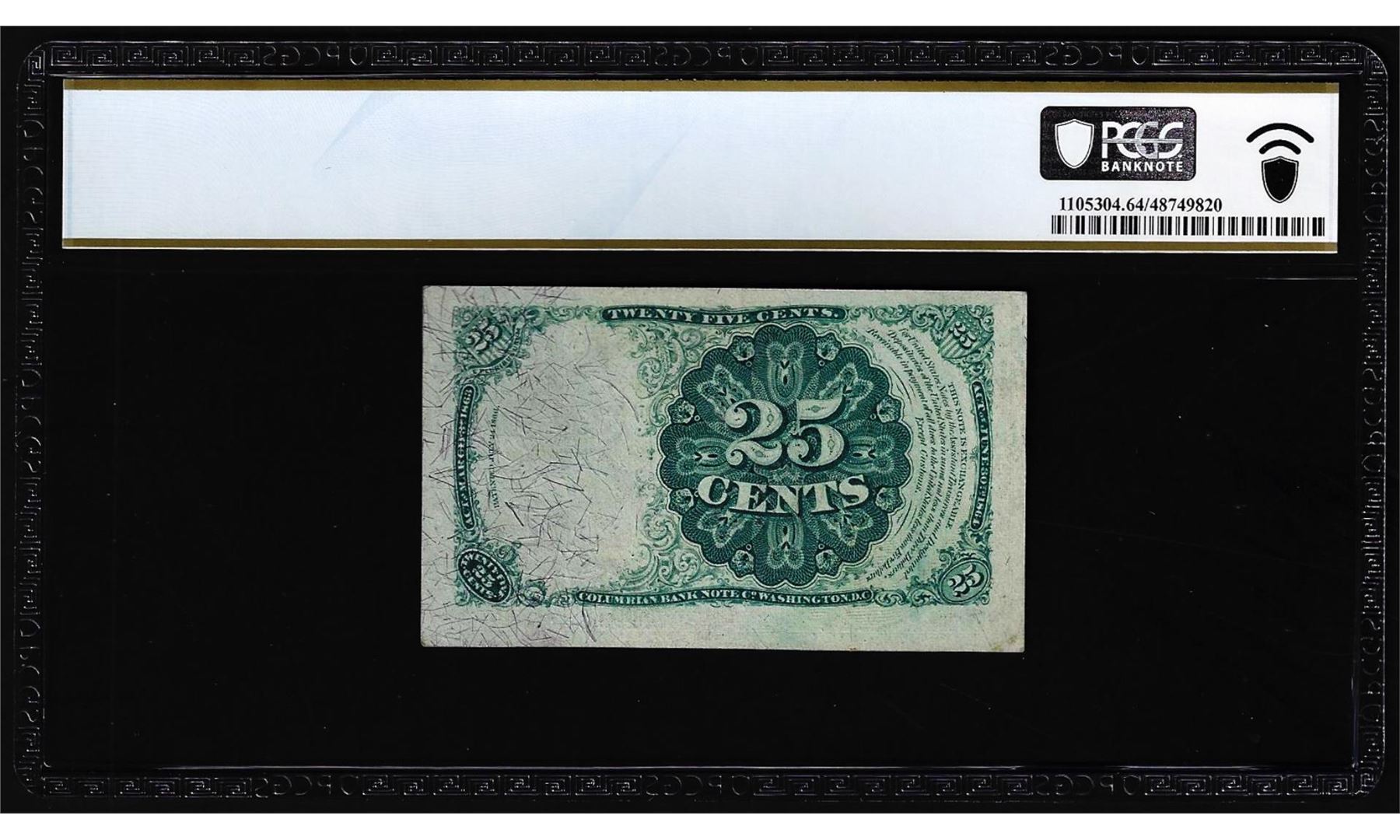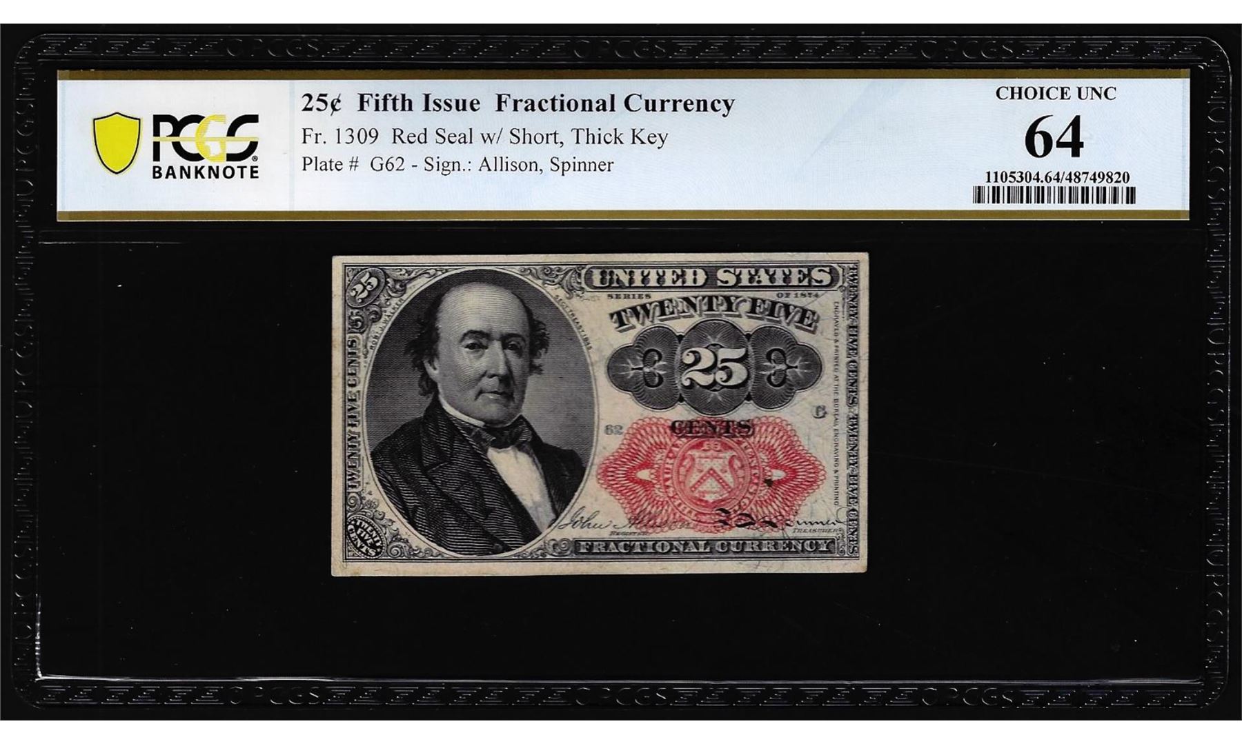 One 1874 Fifth Issue 25 Cents Fractional Currency Note Fr.1309 PCGS Choice Unc 64. PCGS Graded.
