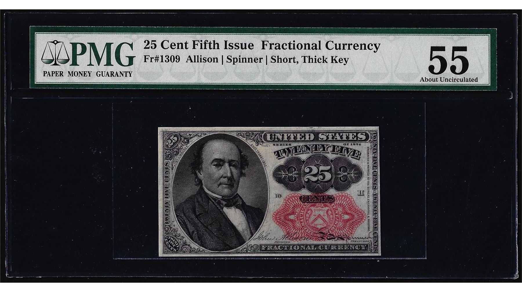 One 1874 Fifth Issue 25 Cents Fractional Currency Note Fr.1309 PMG About Uncirculated 55. PMG Certified.