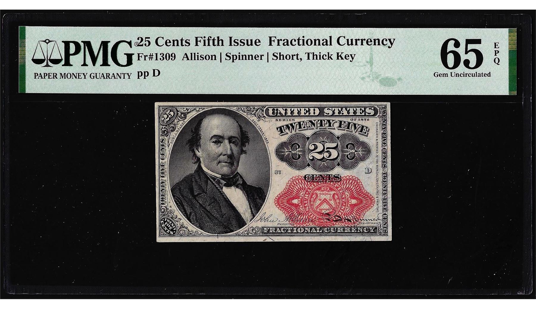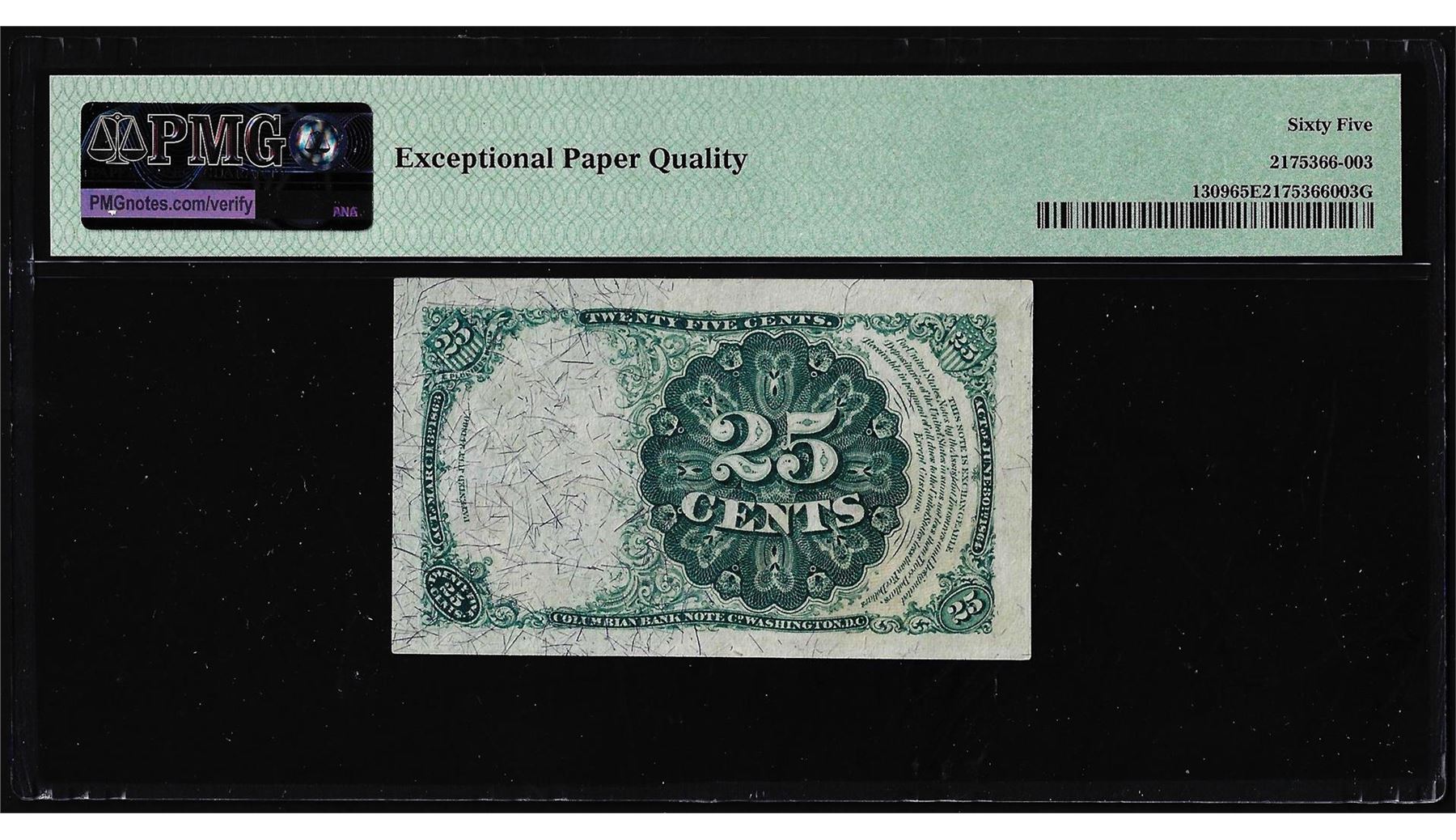One 1874 Fifth Issue 25 Cents Fractional Currency Note Fr.1309 PMG Gem Uncirculated 65EPQ. PMG Certified.