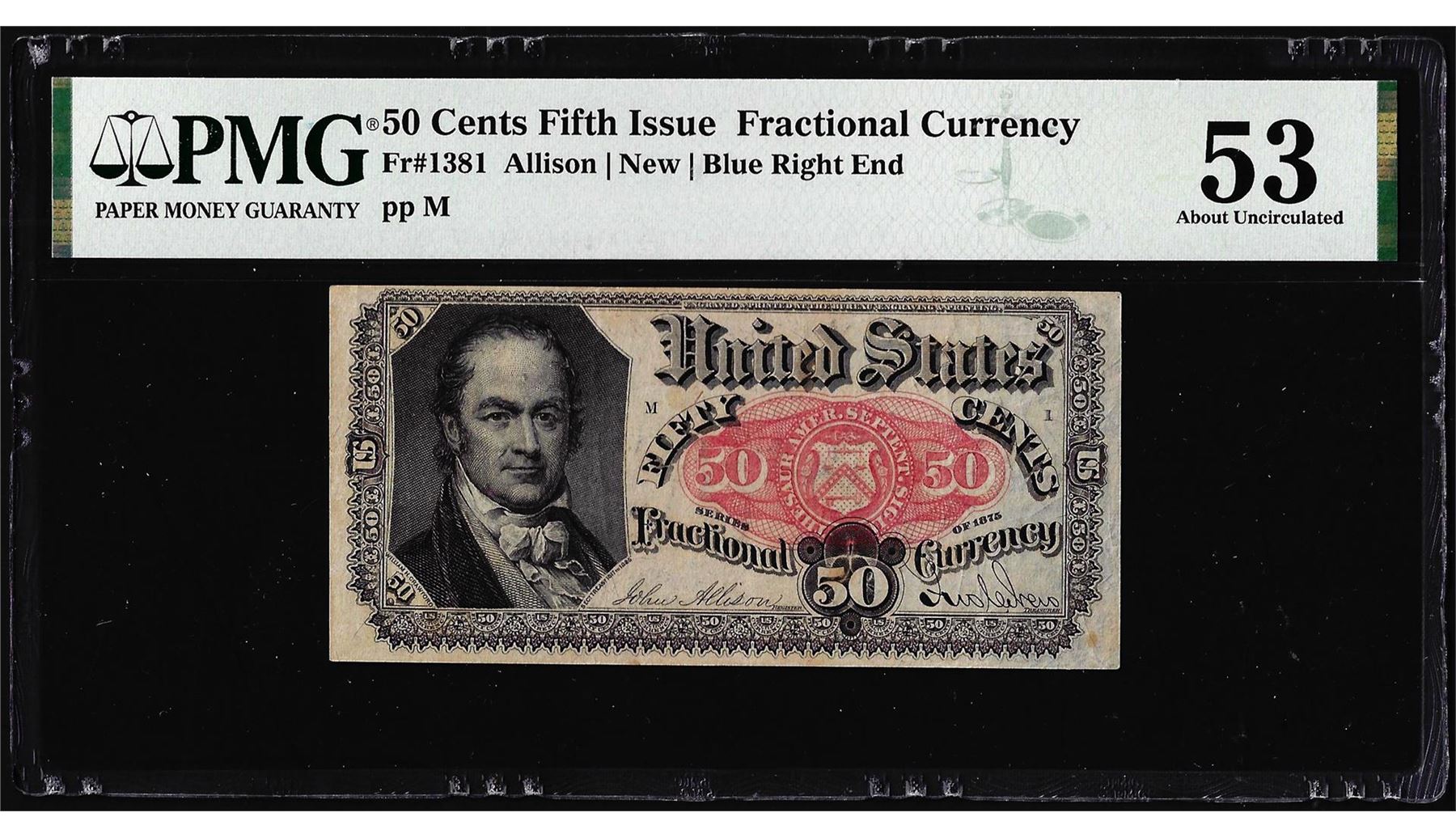 One 1874 Fifth Issue 50 Cent Fractional Currency Note Fr.1381 PMG About Uncirculated 53. PMG Certified.