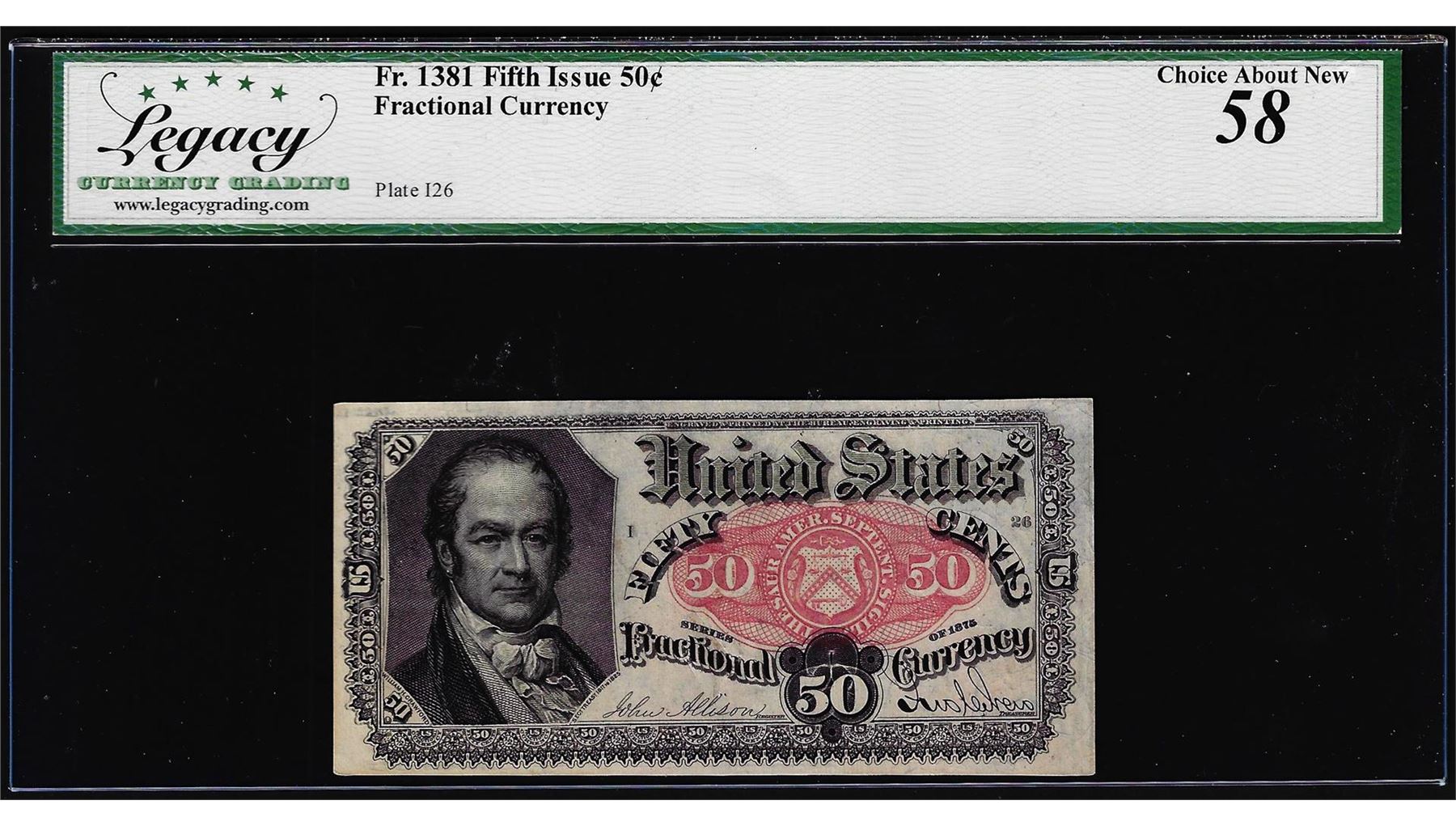 One 1874 Fifth Issue 50 Cents Fractional Currency Note Fr.1381 Legacy Choice About New 58. Legacy Graded.