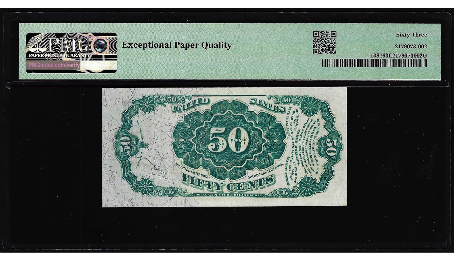 One 1874 Fifth Issue 50 Cents Fractional Currency Note Fr.1381 PMG Ch. Uncirculated 63EPQ. PMG Certified.