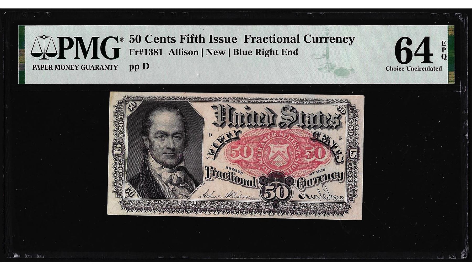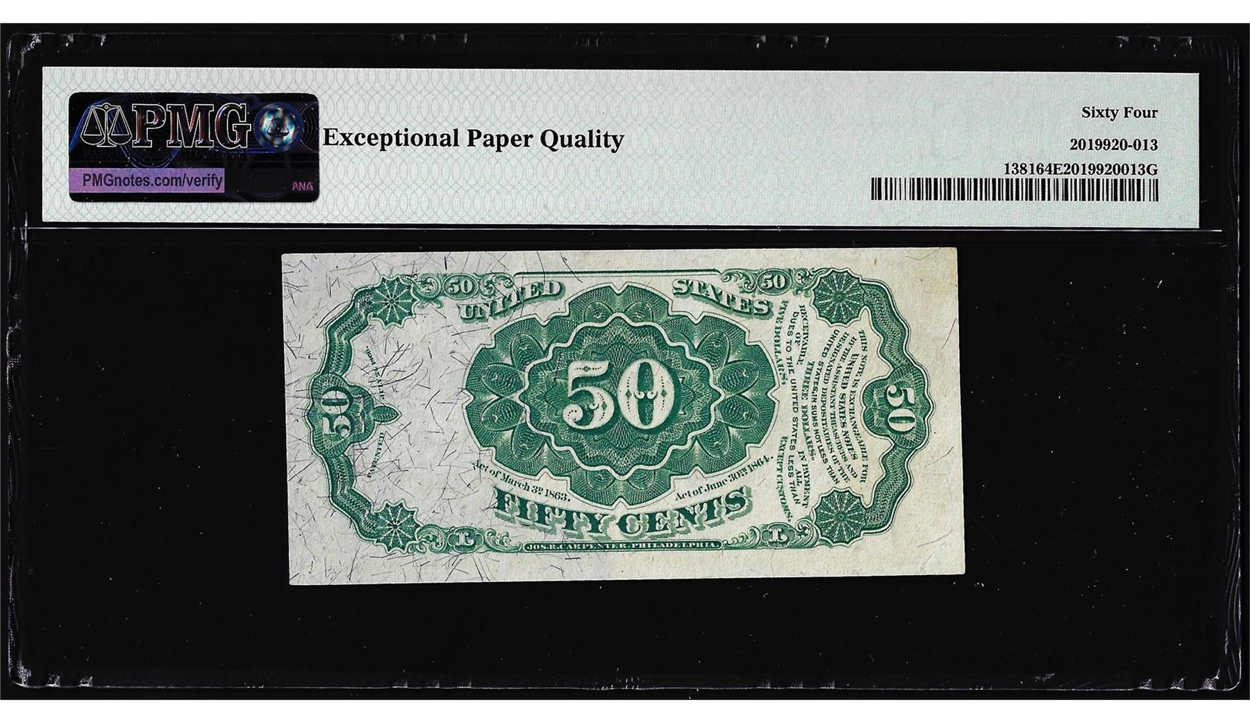 One 1874 Fifth Issue 50 Cents Fractional Currency Note Fr.1381 PMG Ch. Uncirculated 64EPQ. PMG Certified.