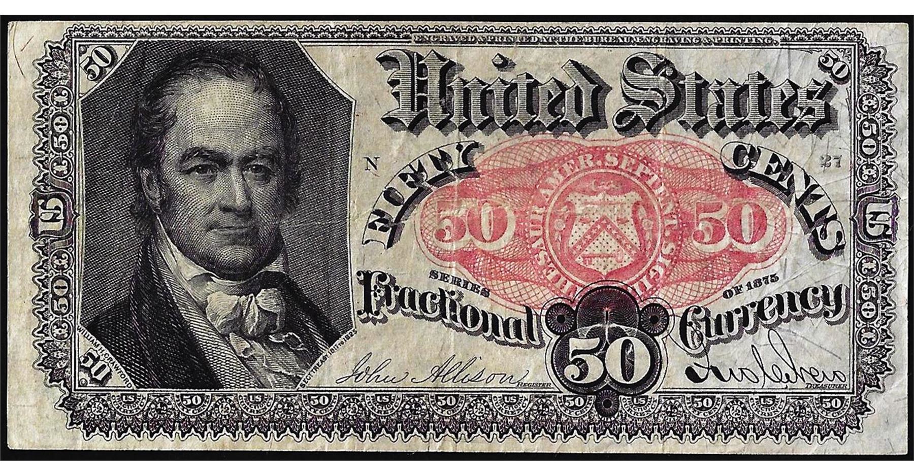 One 1874 Fifth Issue Fifty Cents Fractional Currency Note.