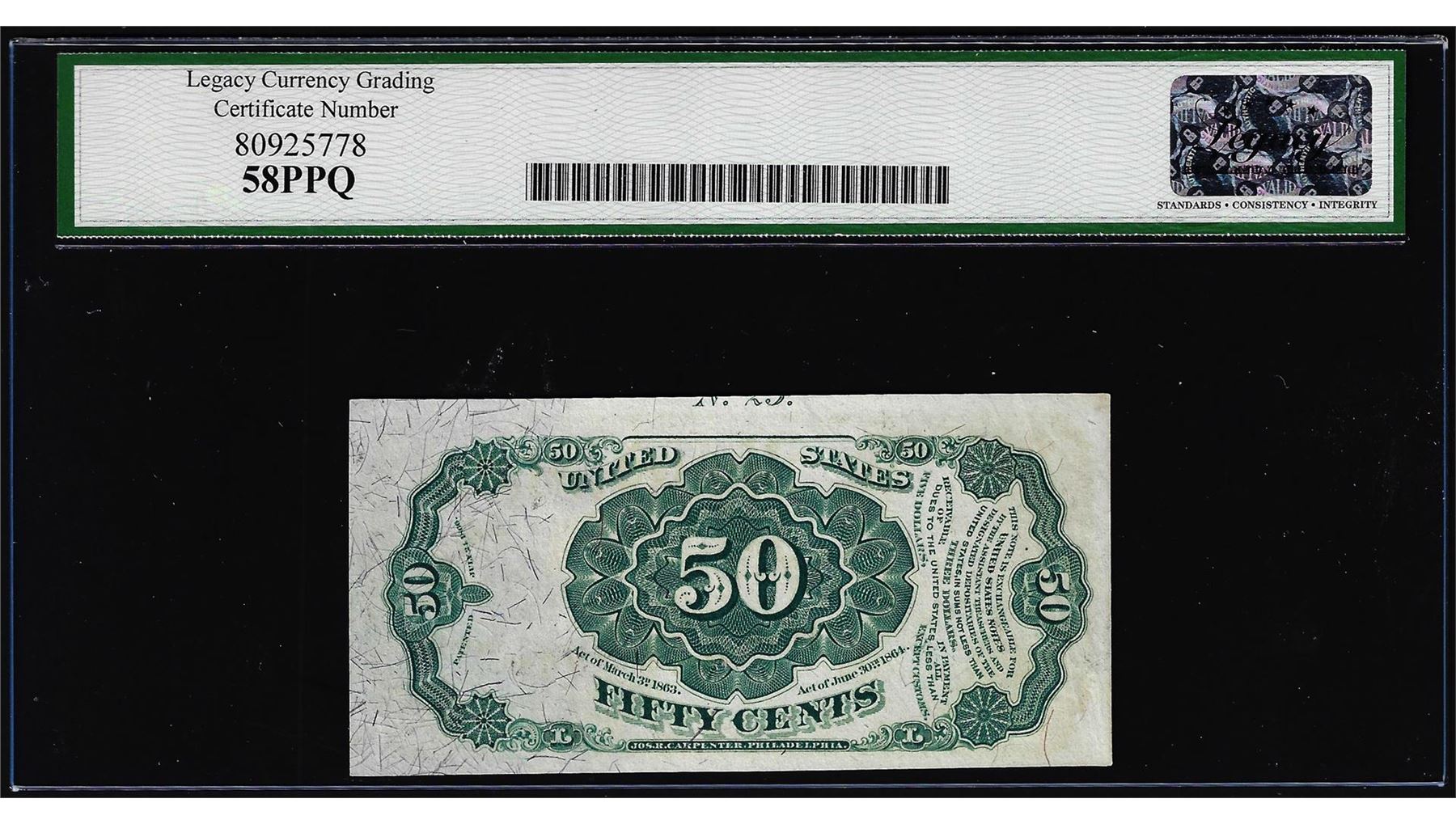 One 1874 Fifth Issue Fifty Cents Fractional Note Fr.1381 Legacy Choice About New 58PPQ. Legacy Graded.