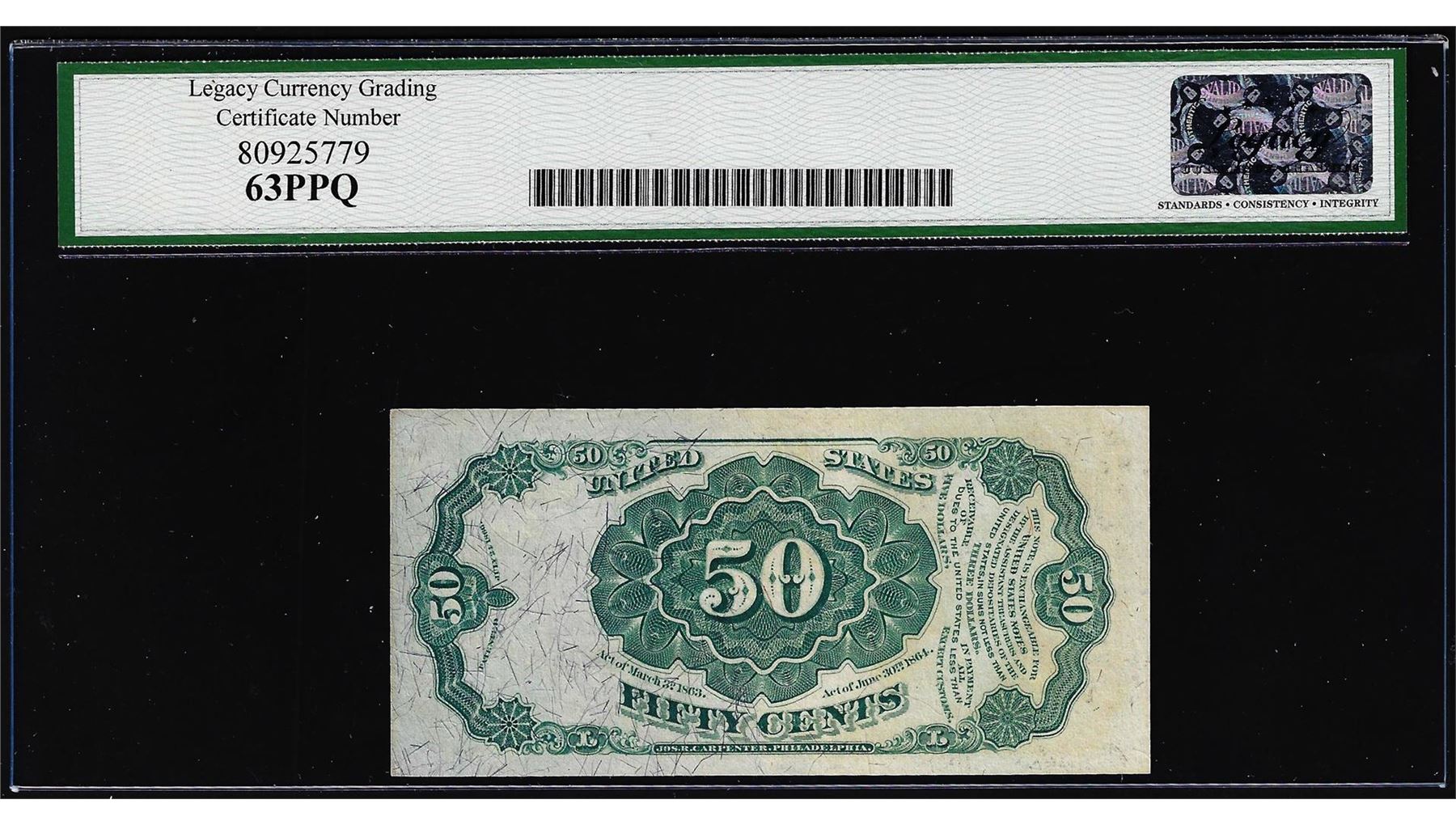 One 1874 Fifth Issue Fifty Cents Fractional Note Fr.1381 Legacy Choice About New 63PPQ. Legacy Graded.