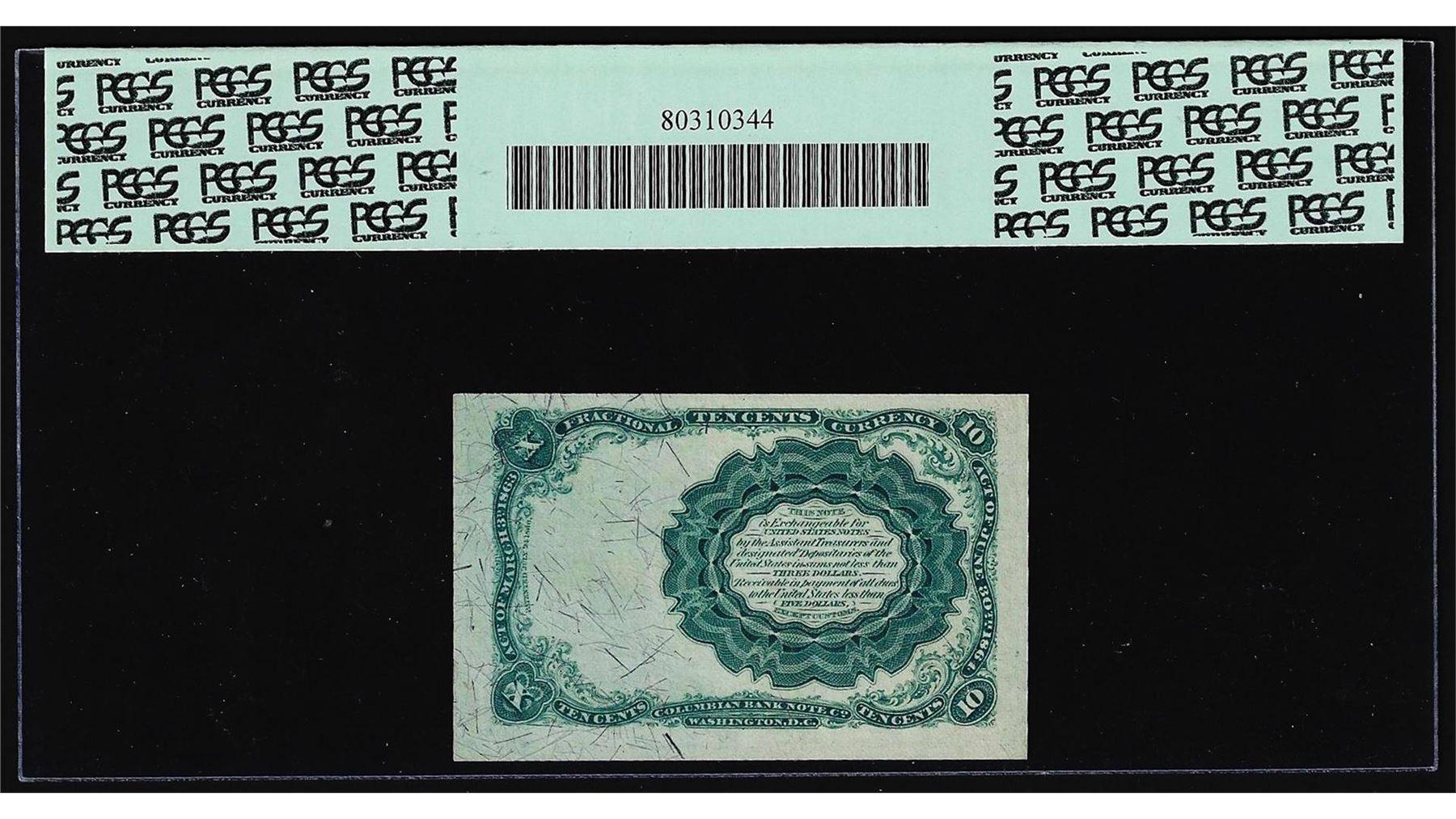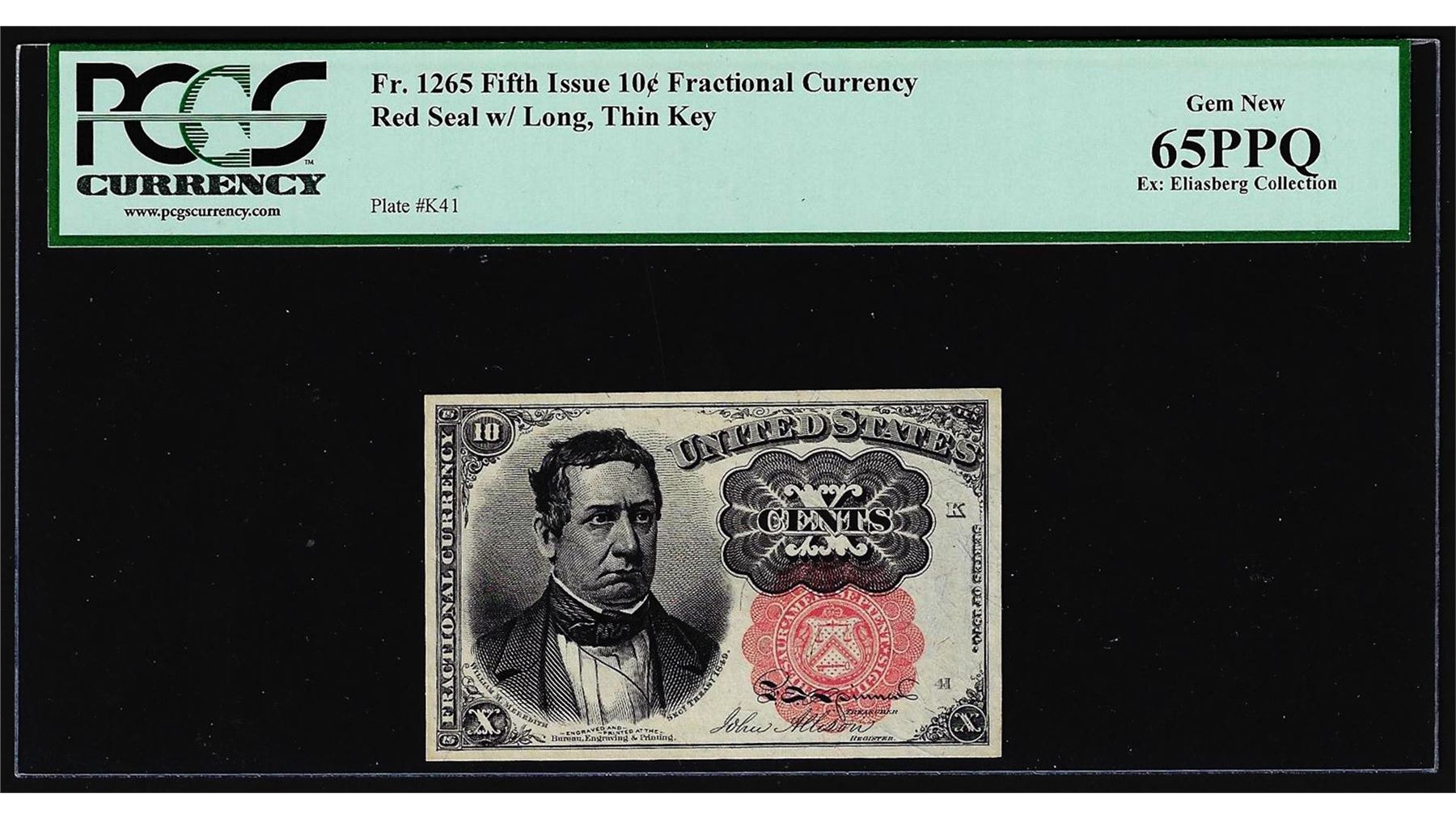 One 1874 Fifth Issue Ten Cent Fractional Currency Note Fr.1265 PCGS Gem New 65PPQ. PCGS Graded.