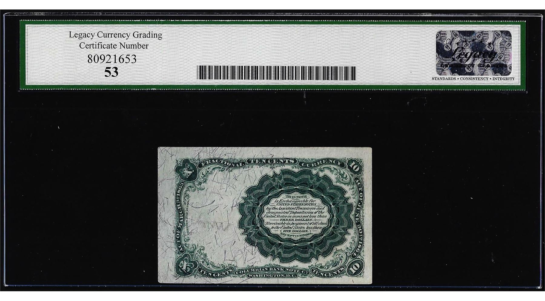One 1874 Fifth Issue Ten Cents Fractional Currency Note Fr.1266 Legacy About New 53. Legacy Graded.