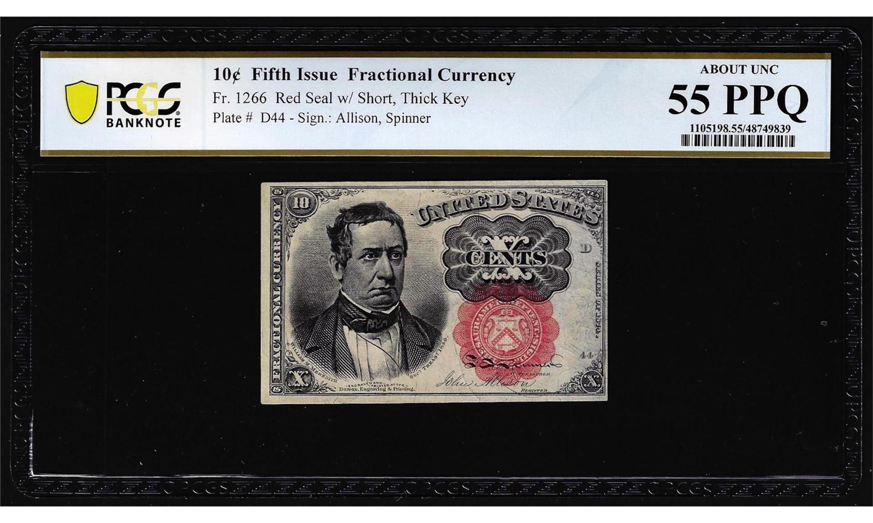 One 1874 Fifth Issue Ten Cents Fractional Currency Note Fr.1266 PCGS About Unc 55PPQ. PCGS Graded.