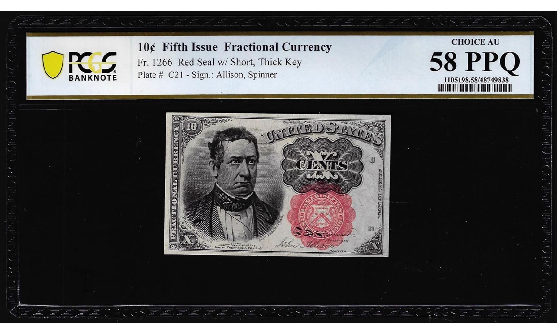 One 1874 Fifth Issue Ten Cents Fractional Currency Note Fr.1266 PCGS Choice AU 58PPQ. PCGS Graded.