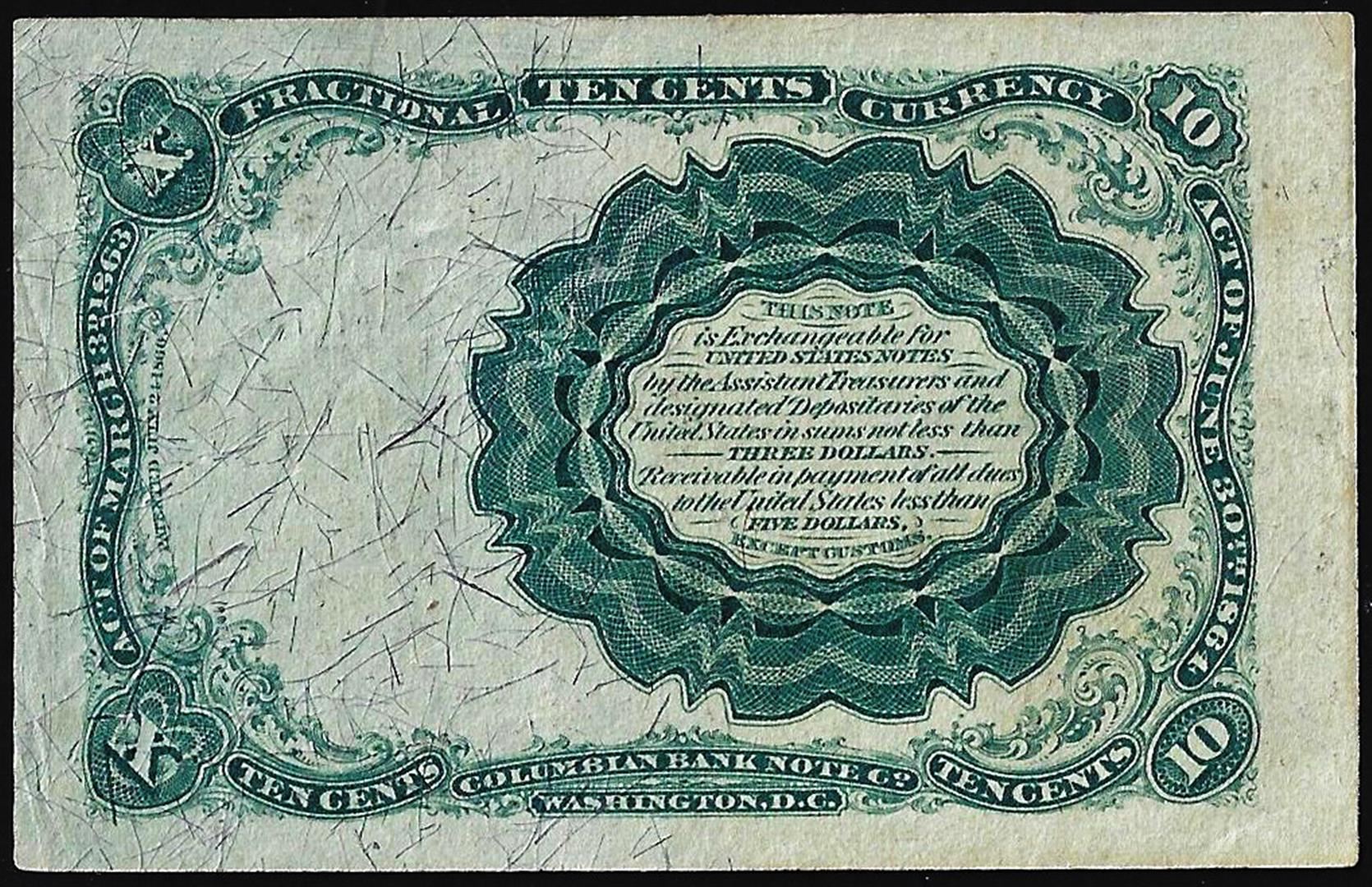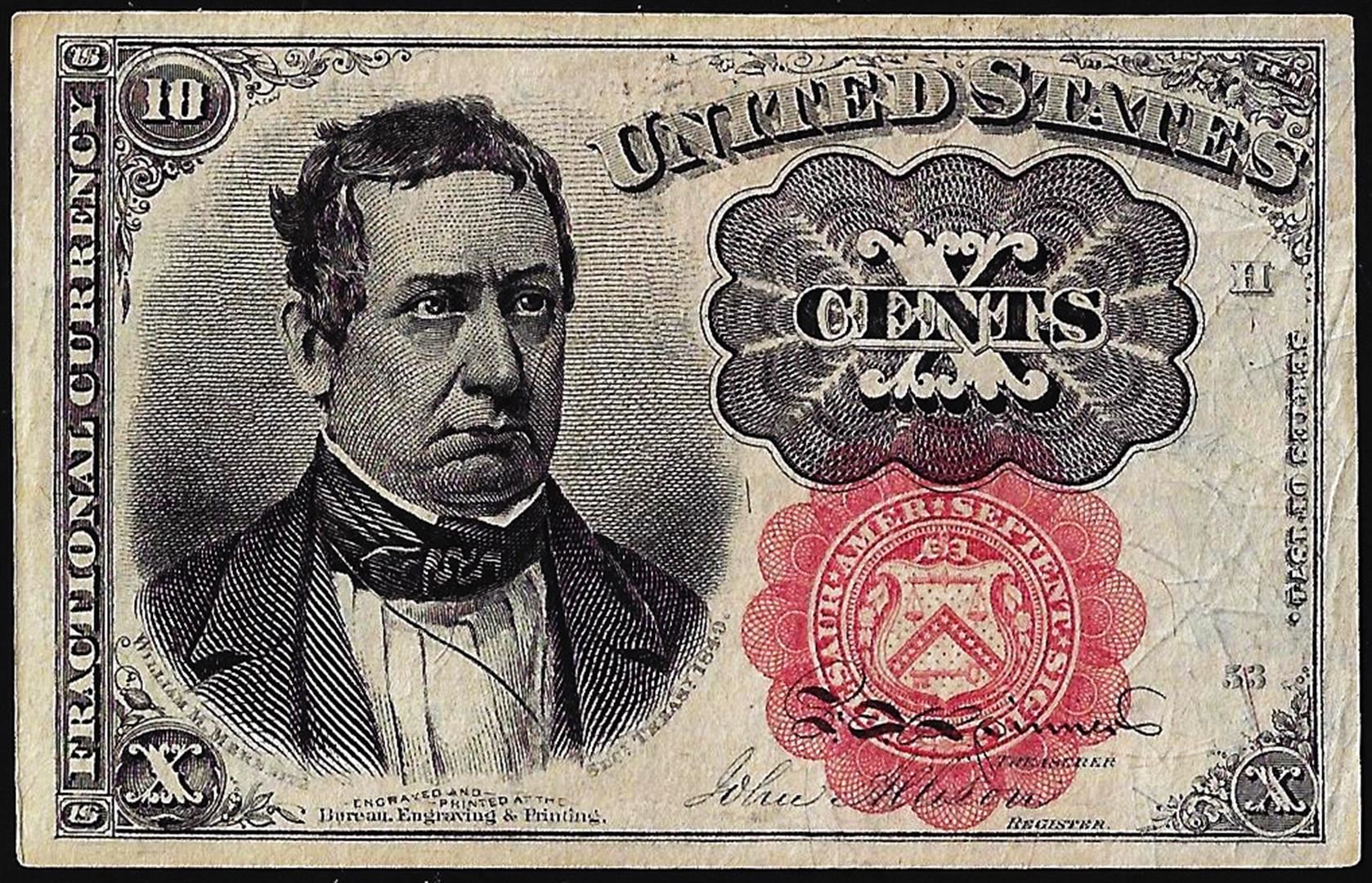 One 1874 Fifth Issue Ten Cents Fractional Currency Note.