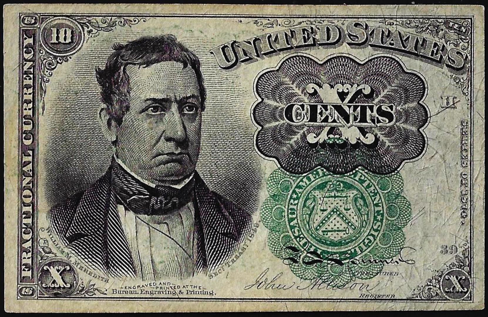 One 1874 Fifth Issue Ten Cents Fractional Currency Note.