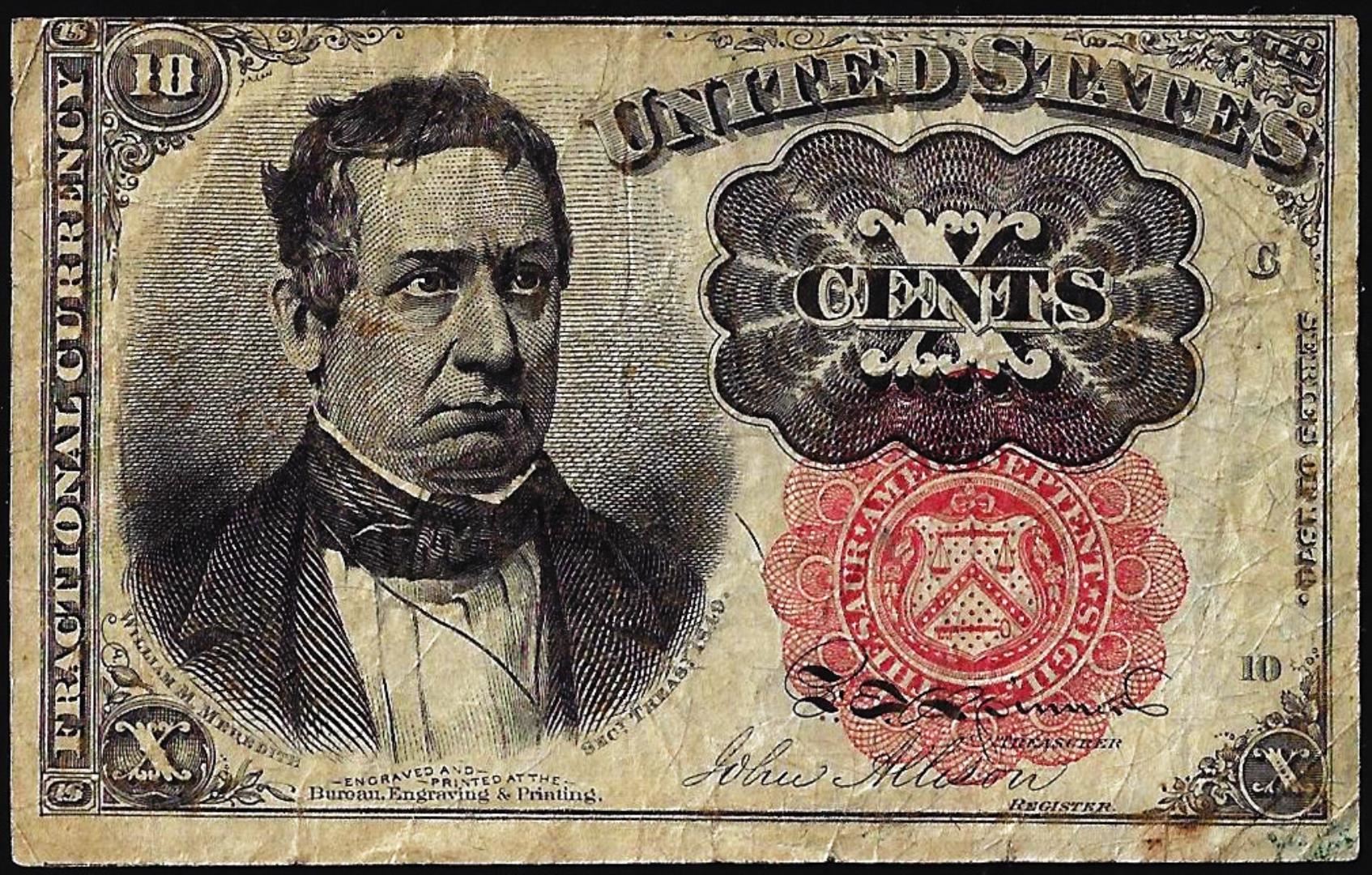 One 1874 Fifth Issue Ten Cents Fractional Currency Note.