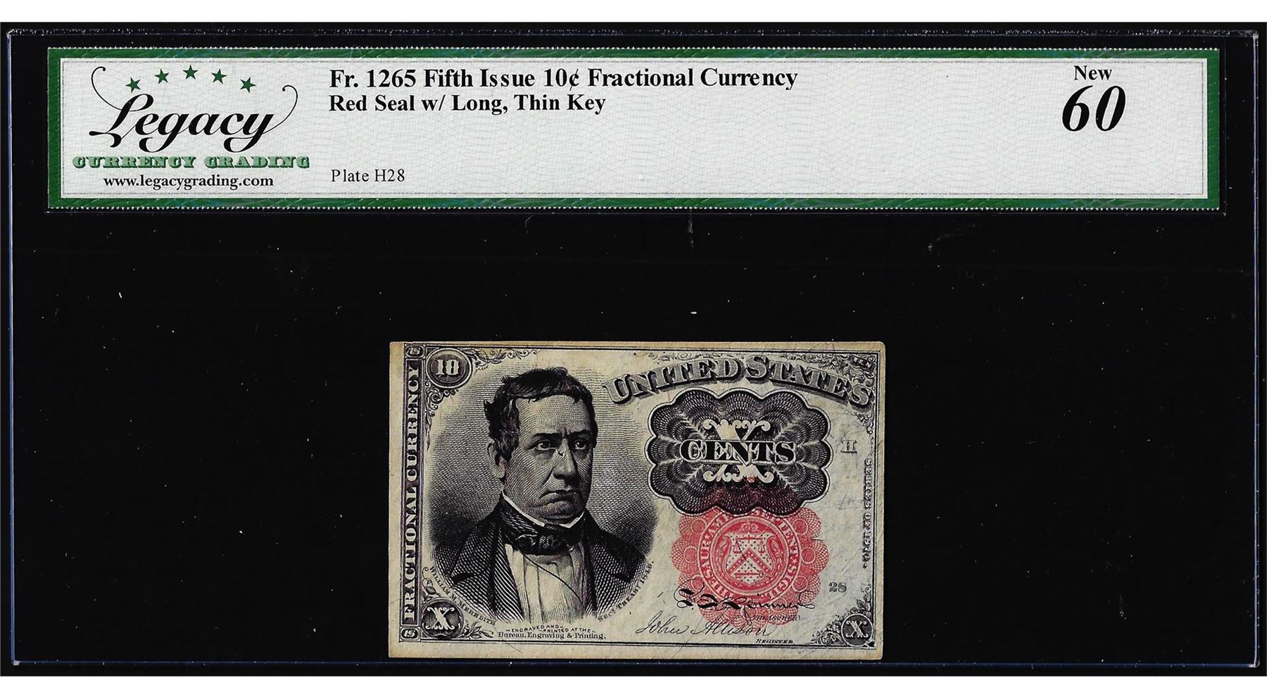 One 1874 Fifth Issue Ten Cents Fractional Note Fr.1265 Legacy New 60. Legacy Graded.