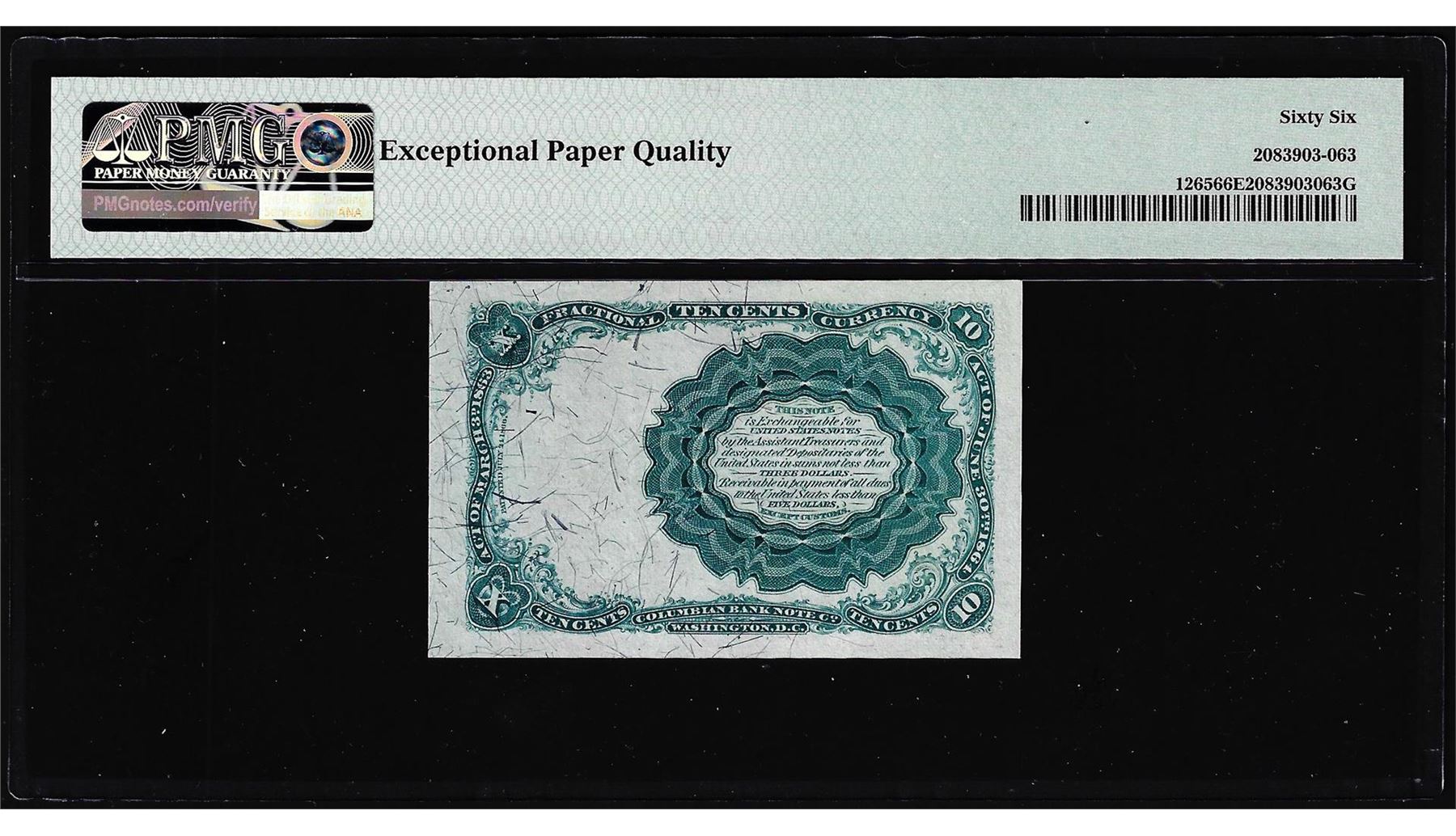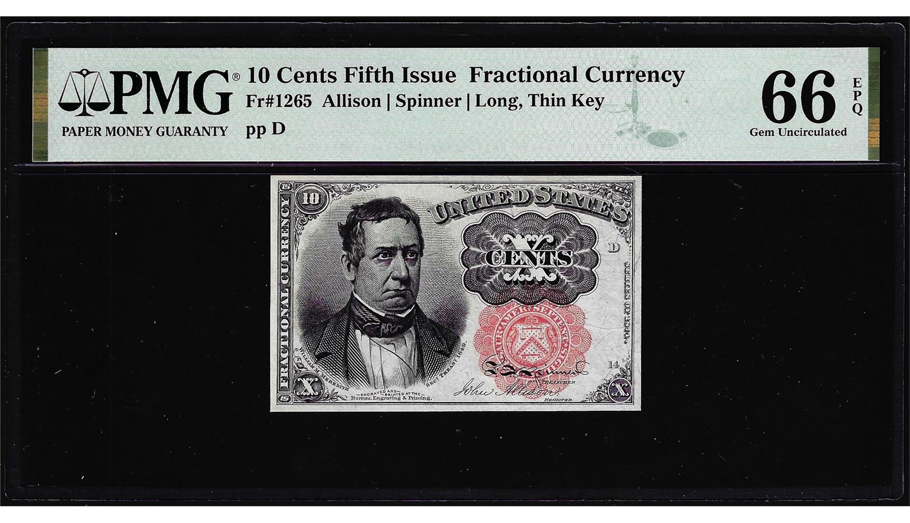 One 1874 Fifth Issue Ten Cents Fractional Note Fr.1265 PMG Gem Uncirculated 66EPQ. PMG Certified.