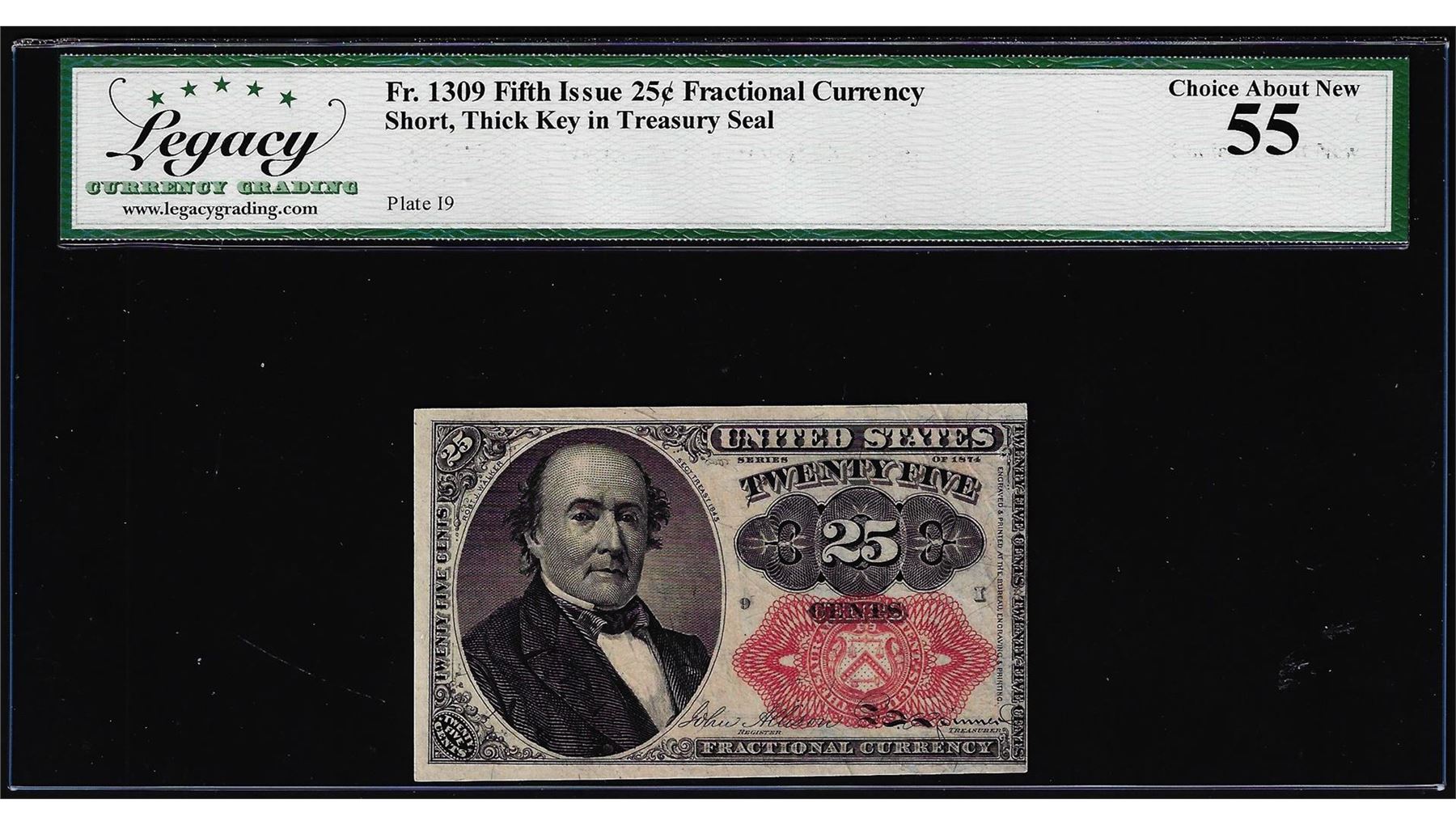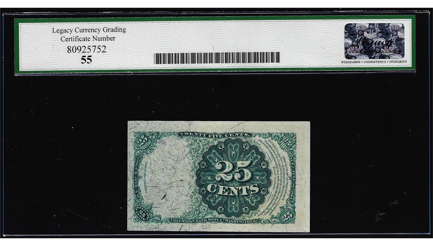 One 1874 Fifth Issue Twenty-Five Cent Fractional Note Fr.1309 Legacy Choice About New 55. Legacy Graded.