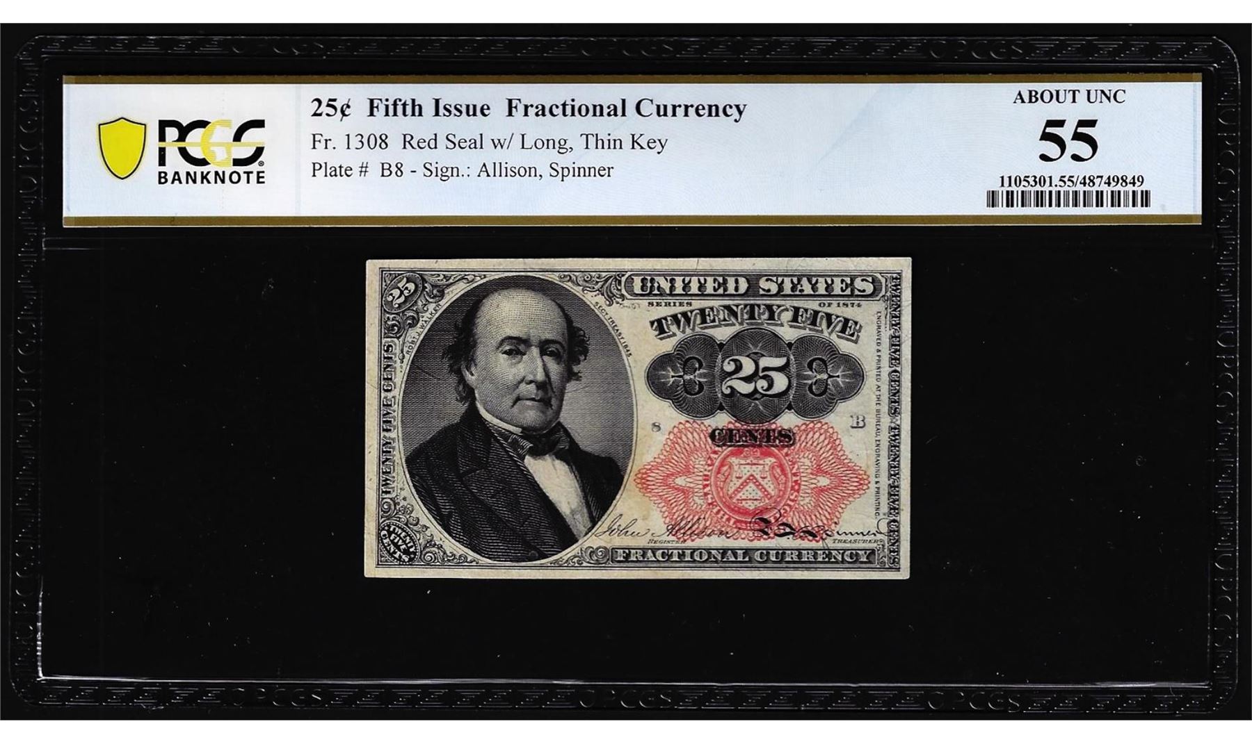 One 1874 Fifth Issue Twenty-Five Cents Fractional Currency Note Fr.1308 PCGS About Unc 55. PCGS Graded.