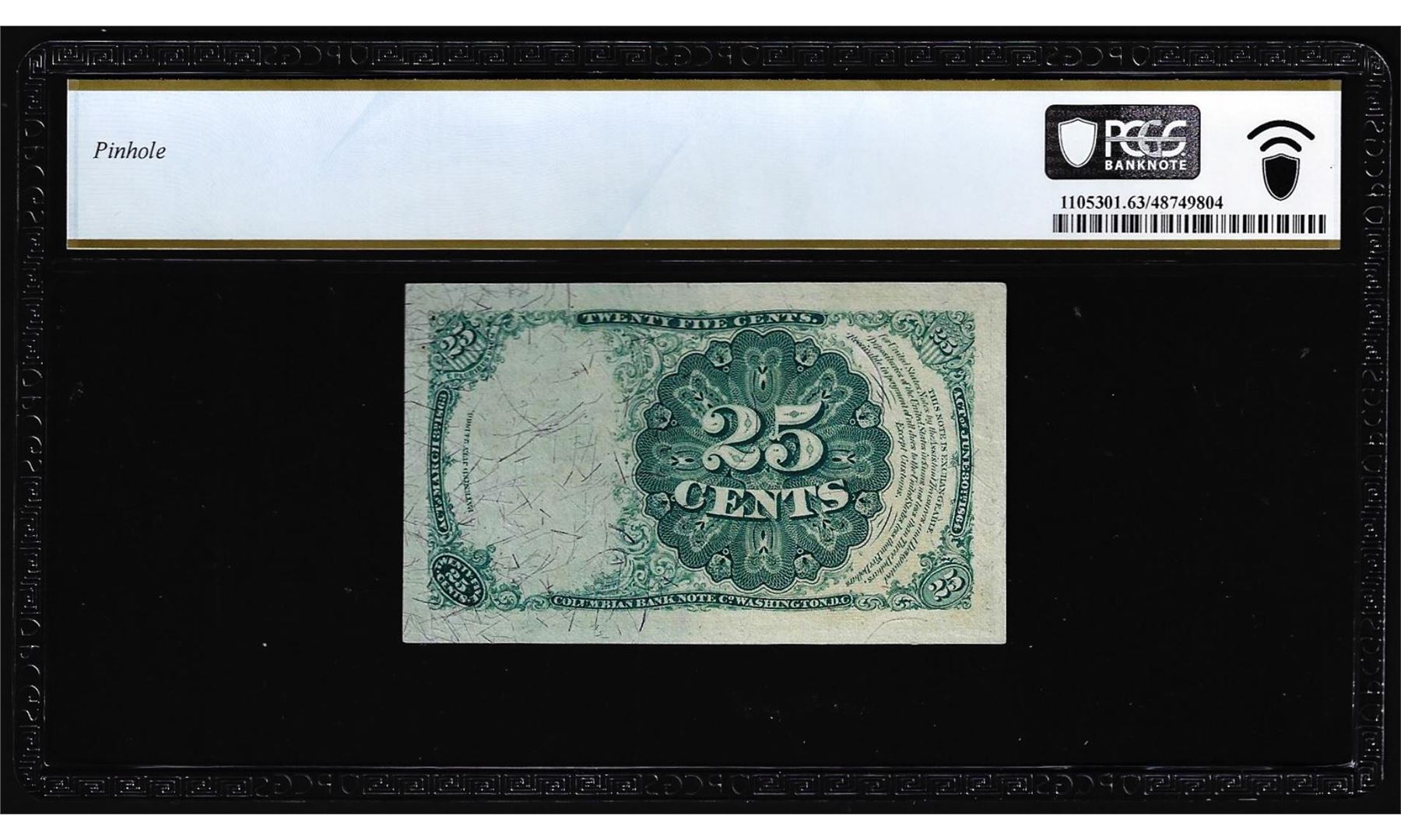 One 1874 Fifth Issue Twenty-Five Cents Fractional Currency Note Fr.1308 PCGS Choice Unc 63. PCGS Graded.