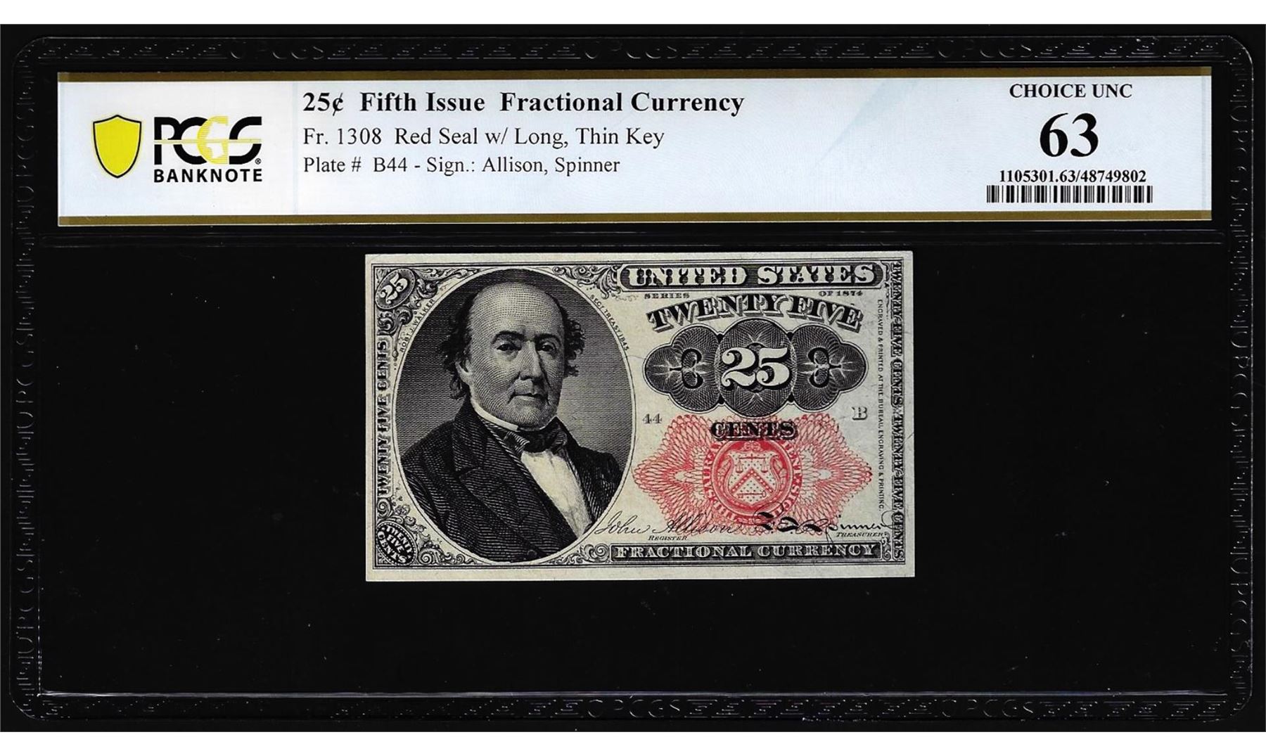 One 1874 Fifth Issue Twenty-Five Cents Fractional Currency Note Fr.1308 PCGS Choice Unc 63. PCGS Graded.