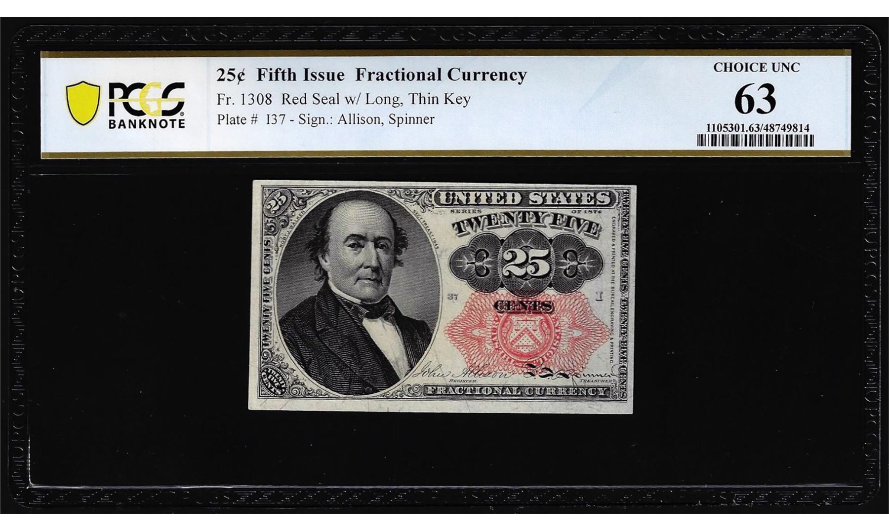 One 1874 Fifth Issue Twenty-Five Cents Fractional Currency Note Fr.1308 PCGS Choice Unc 63. PCGS Graded.