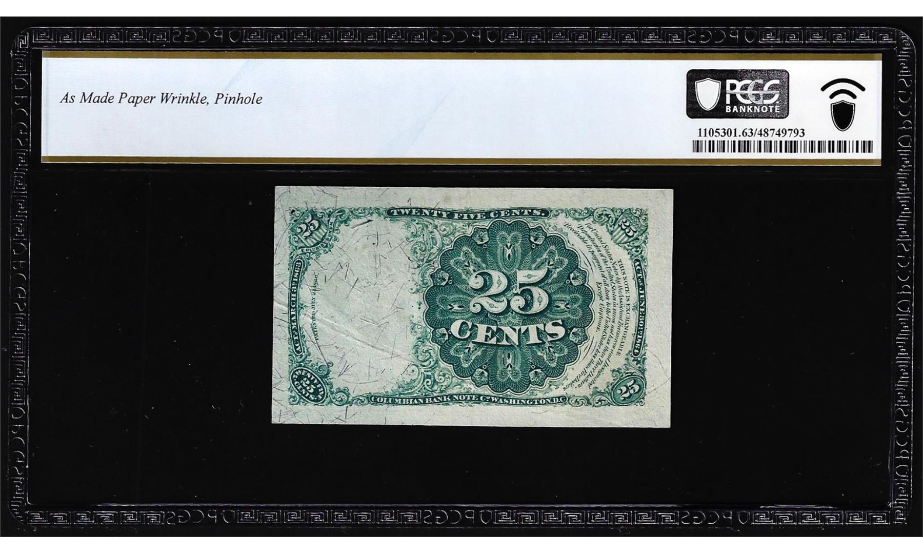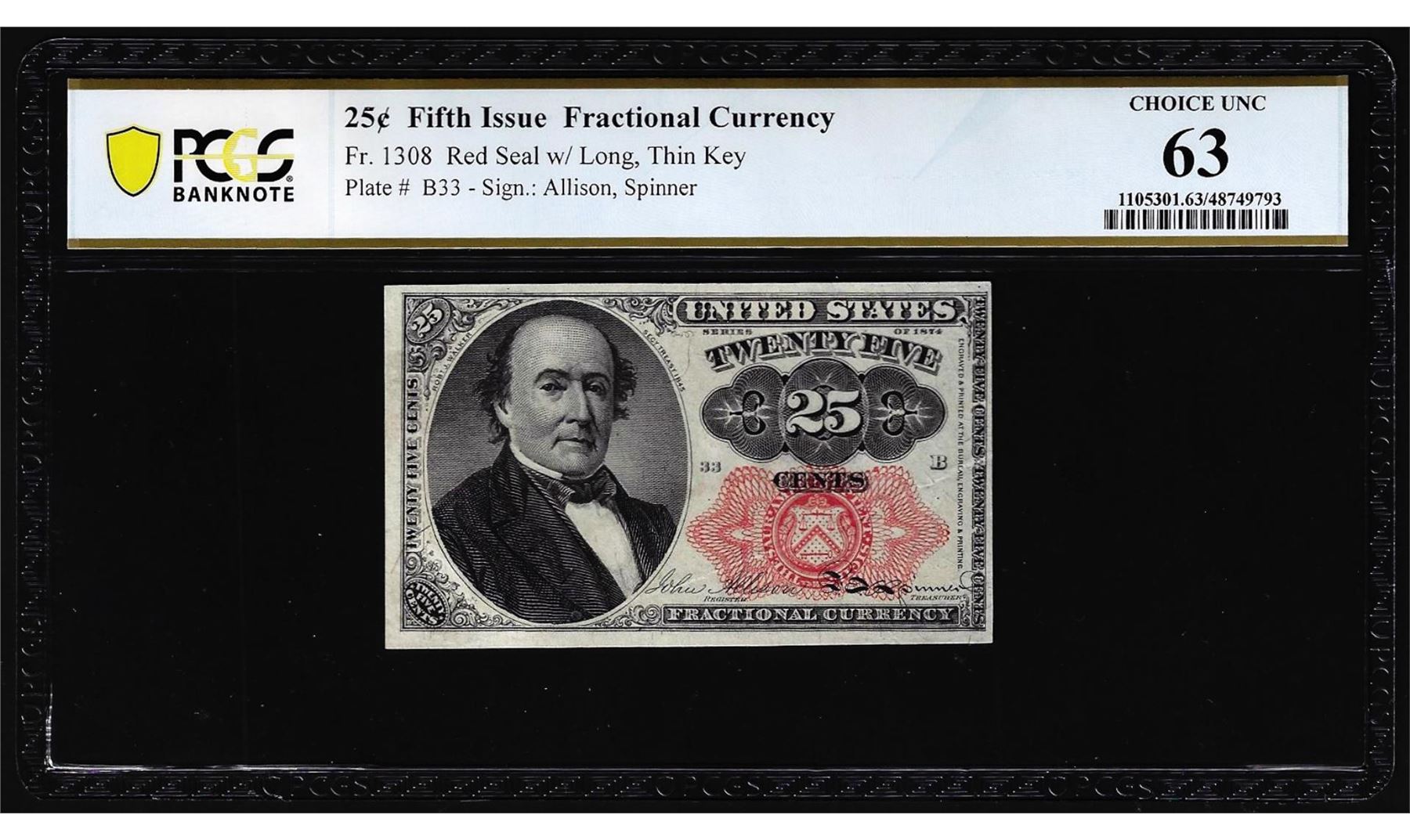 One 1874 Fifth Issue Twenty-Five Cents Fractional Currency Note Fr.1308 PCGS Choice Unc 63. PCGS Graded.
