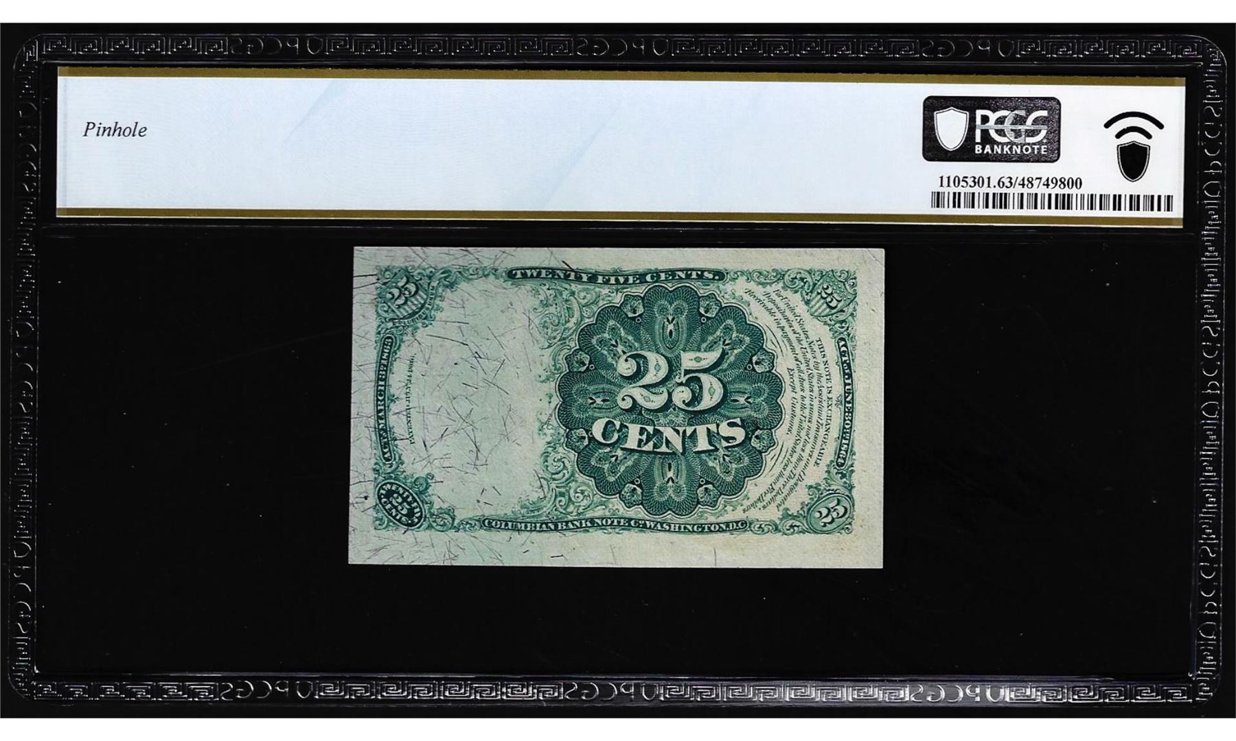 One 1874 Fifth Issue Twenty-Five Cents Fractional Currency Note Fr.1308 PCGS Choice Unc 63. PCGS Graded.