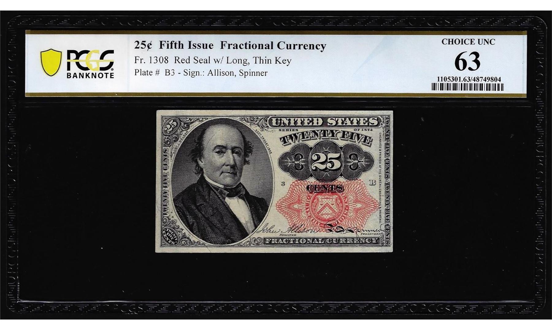 One 1874 Fifth Issue Twenty-Five Cents Fractional Currency Note Fr.1308 PCGS Choice Unc 63. PCGS Graded.