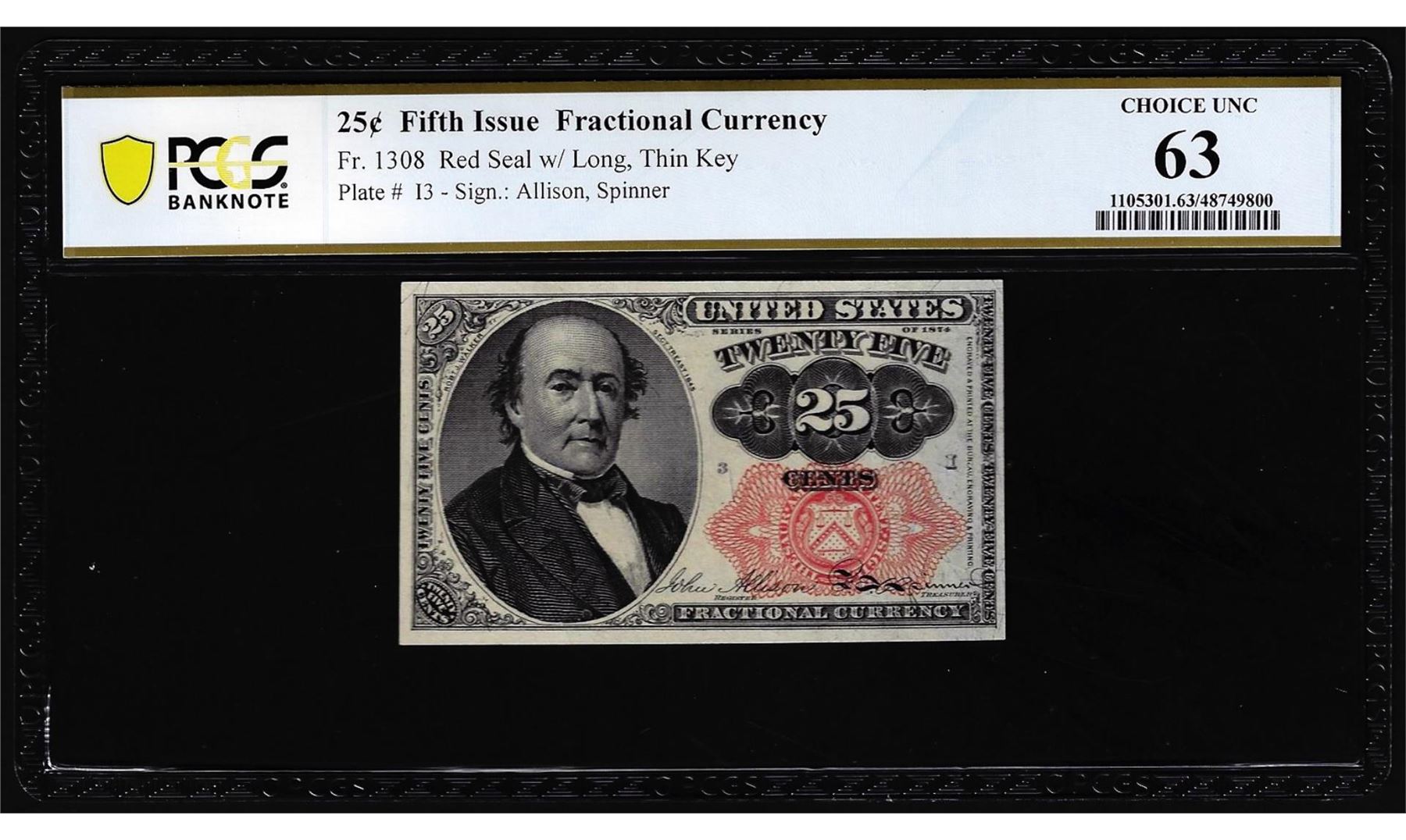 One 1874 Fifth Issue Twenty-Five Cents Fractional Currency Note Fr.1308 PCGS Choice Unc 63. PCGS Graded.